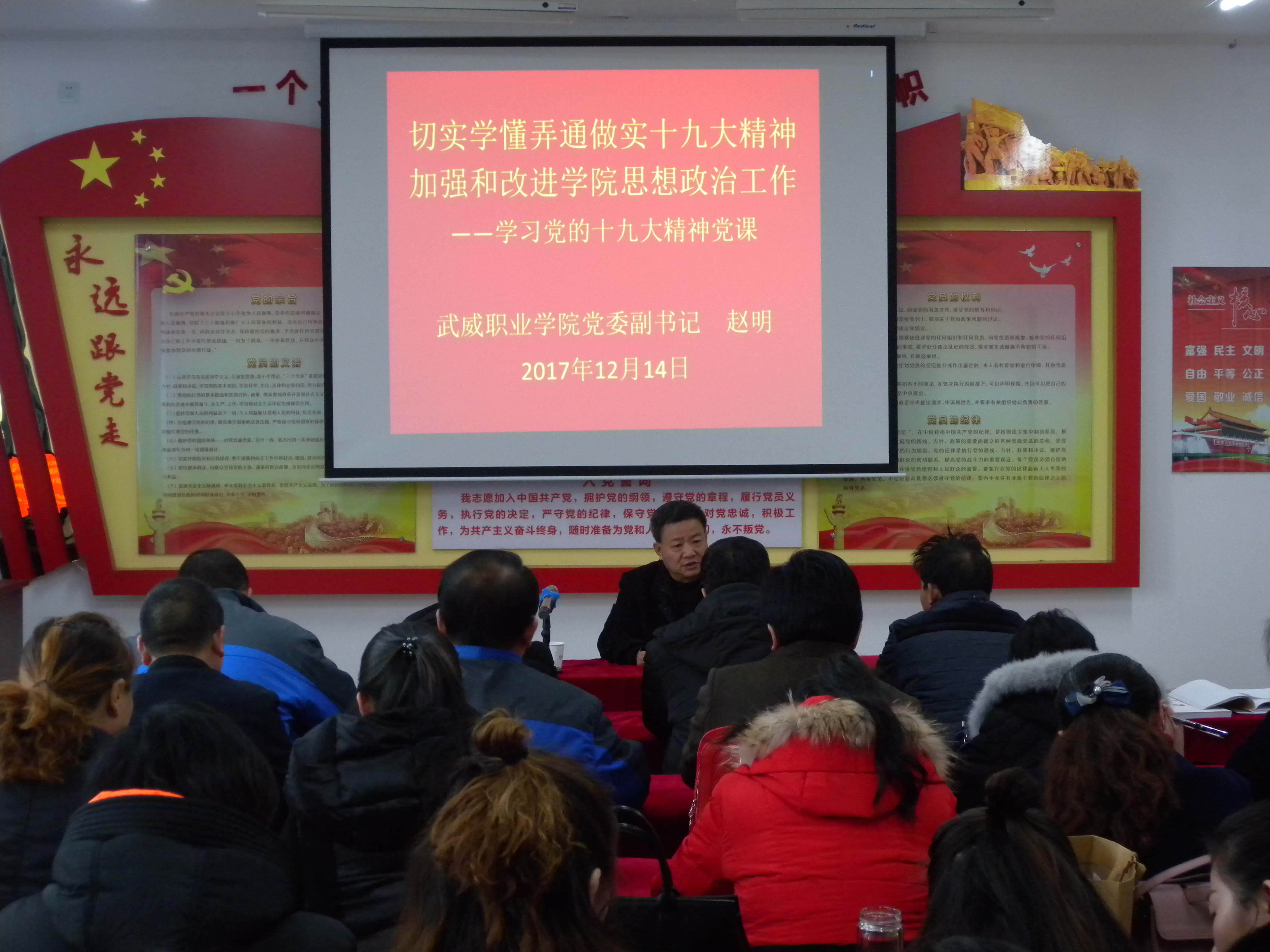 12月14日下午,人文藝術(shù)教育系黨總支邀請學院黨委副書記趙明同志到我系、馬克思主義學院講黨課,趙明同志結(jié)合自身學習十九大及習近平總書記在全國高校思想政治工作會議上的講話精神體會,做了題為《切實學懂弄通做實十九大精神? 加強大學生思想政治工作》的黨課,全體教師聆聽了黨課。