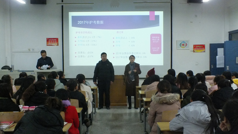 為了進(jìn)一步提高我系學(xué)生的專業(yè)水平和護(hù)考過關(guān)率,讓2018屆畢業(yè)生更好地應(yīng)對護(hù)士資格考試,12月20日晚,護(hù)理系在明遠(yuǎn)樓211教室舉辦了以護(hù)考為主題的講座,15級護(hù)理、助產(chǎn)專業(yè)共100余人聆聽了此次講座。護(hù)理系黨總支書記張建輝、系主任韓曉萍參加講座并講話。
