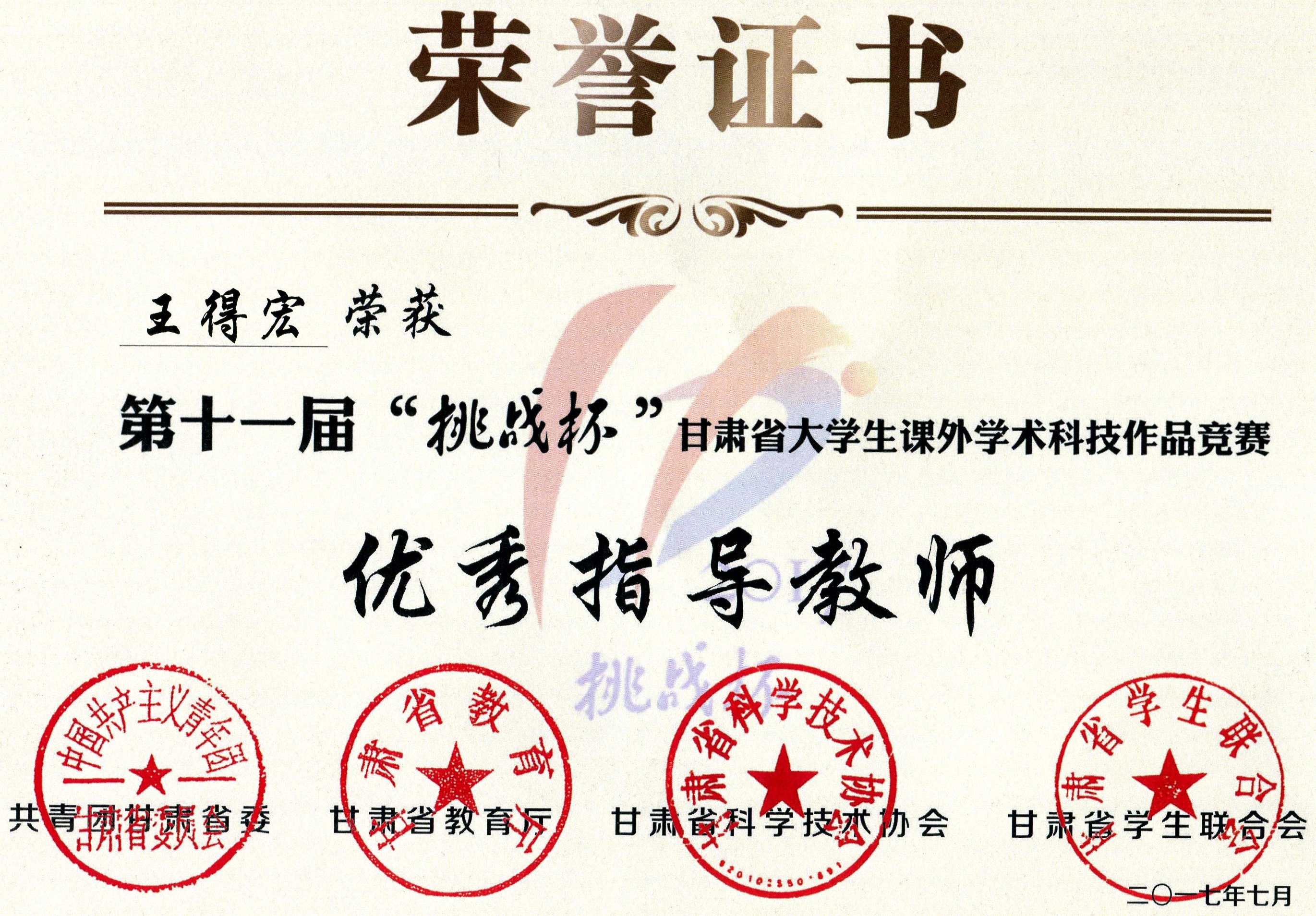 第十一屆“挑戰(zhàn)杯”甘肅省大學(xué)生課外學(xué)術(shù)科技作品競(jìng)賽“優(yōu)秀指導(dǎo)教師”