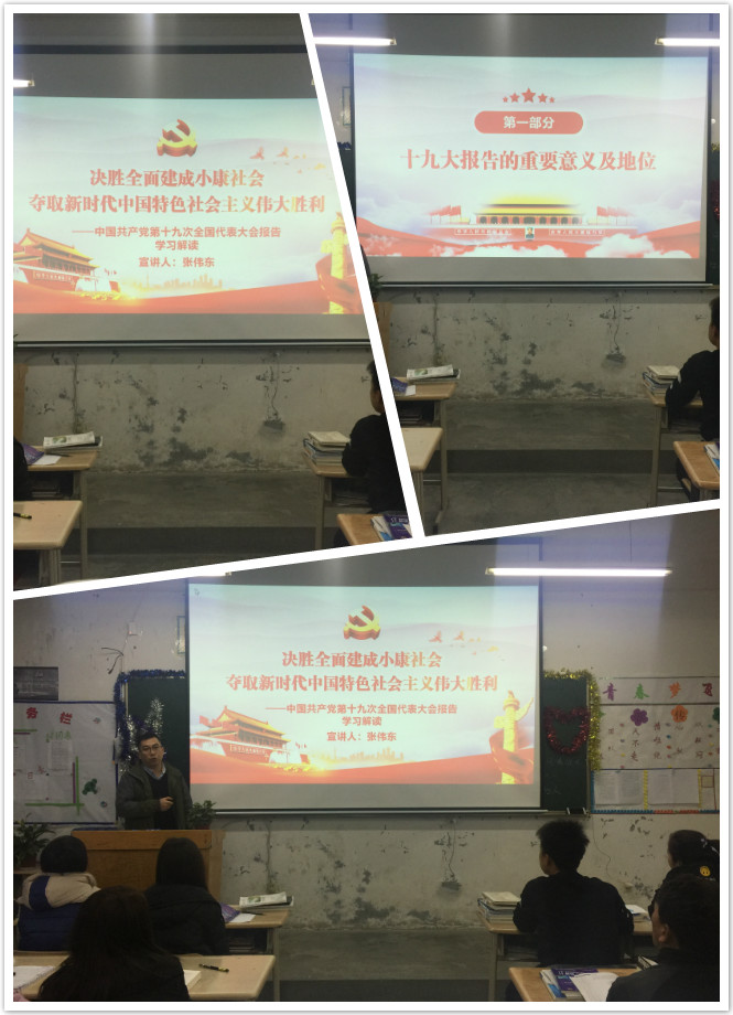 12月20日晚自習時間,在17級計算機網絡大專班教室,電信系黨員教師張偉東同志給學生們以《深入學習重點解讀十九屆大會議報告精神》為主題,對十九大報告進行了全方位的宣講解讀。