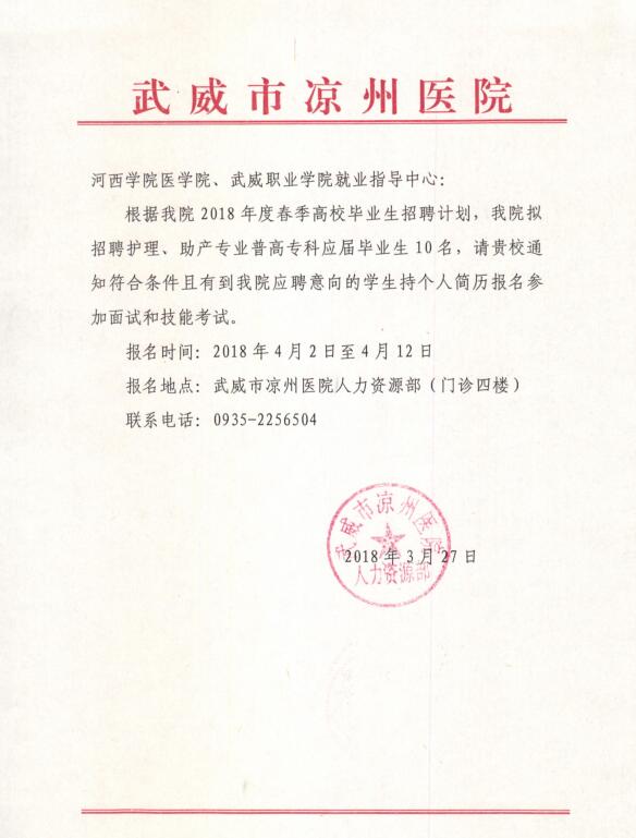 ? ? ? ?武威市涼州醫(yī)院擬招聘護理、助產(chǎn)專業(yè)畢業(yè)生10名,報名時間2018年4月2日~4月12日,報名時請攜帶個人簡歷,一寸彩色照片一張,請我系15級應(yīng)屆畢業(yè)生積極響應(yīng),踴躍報名!