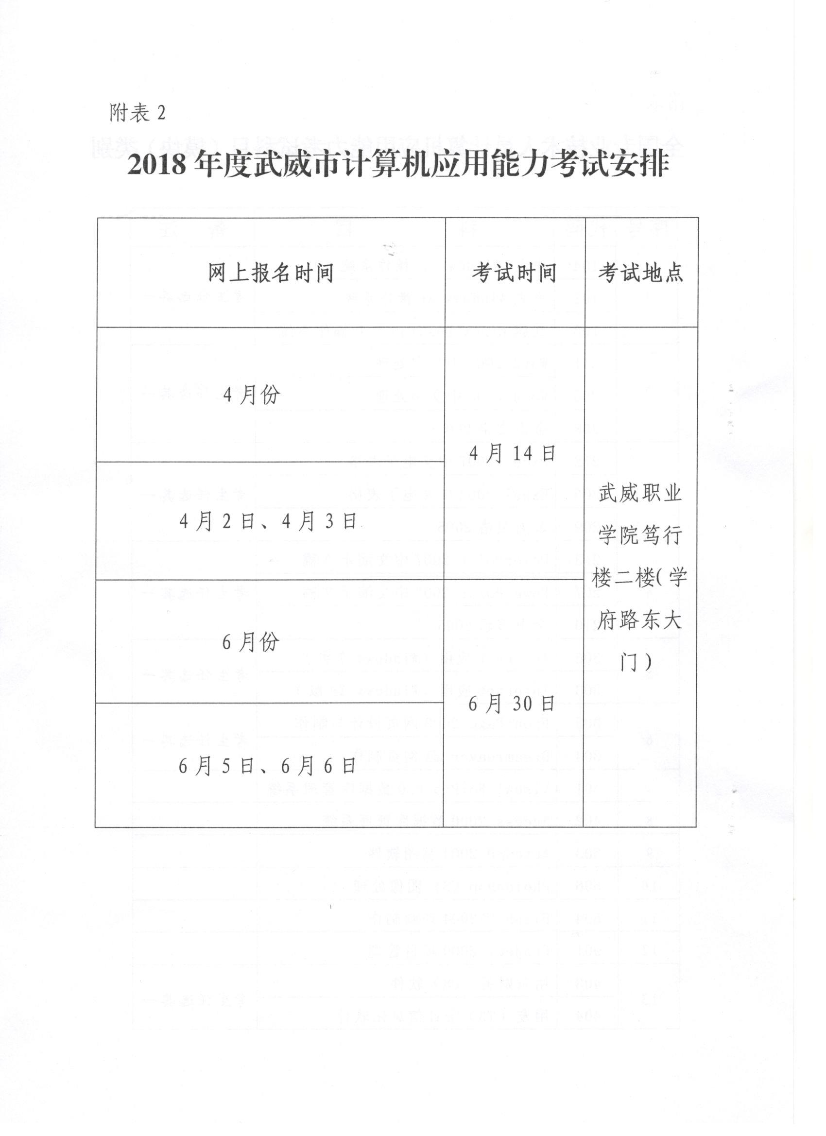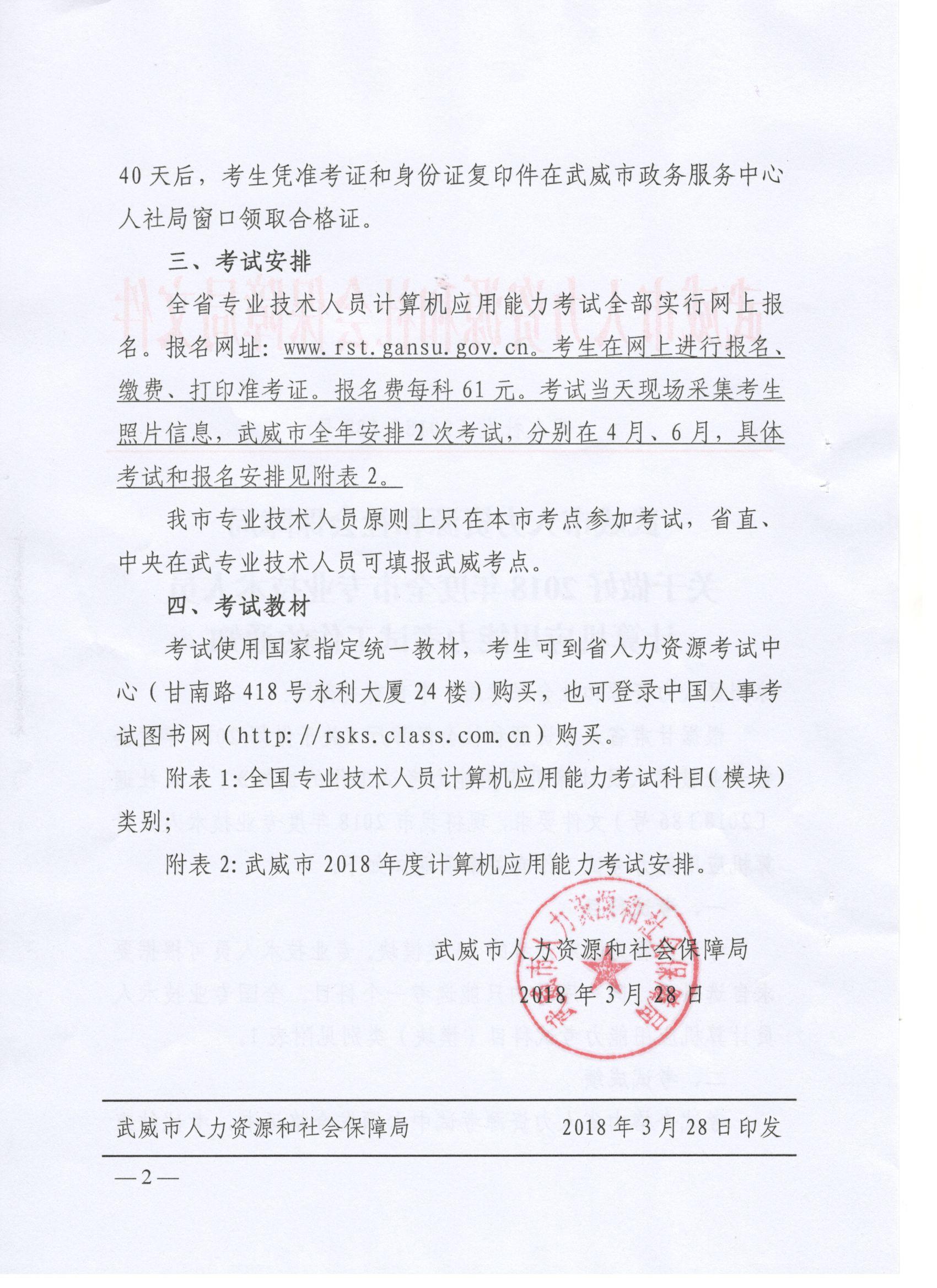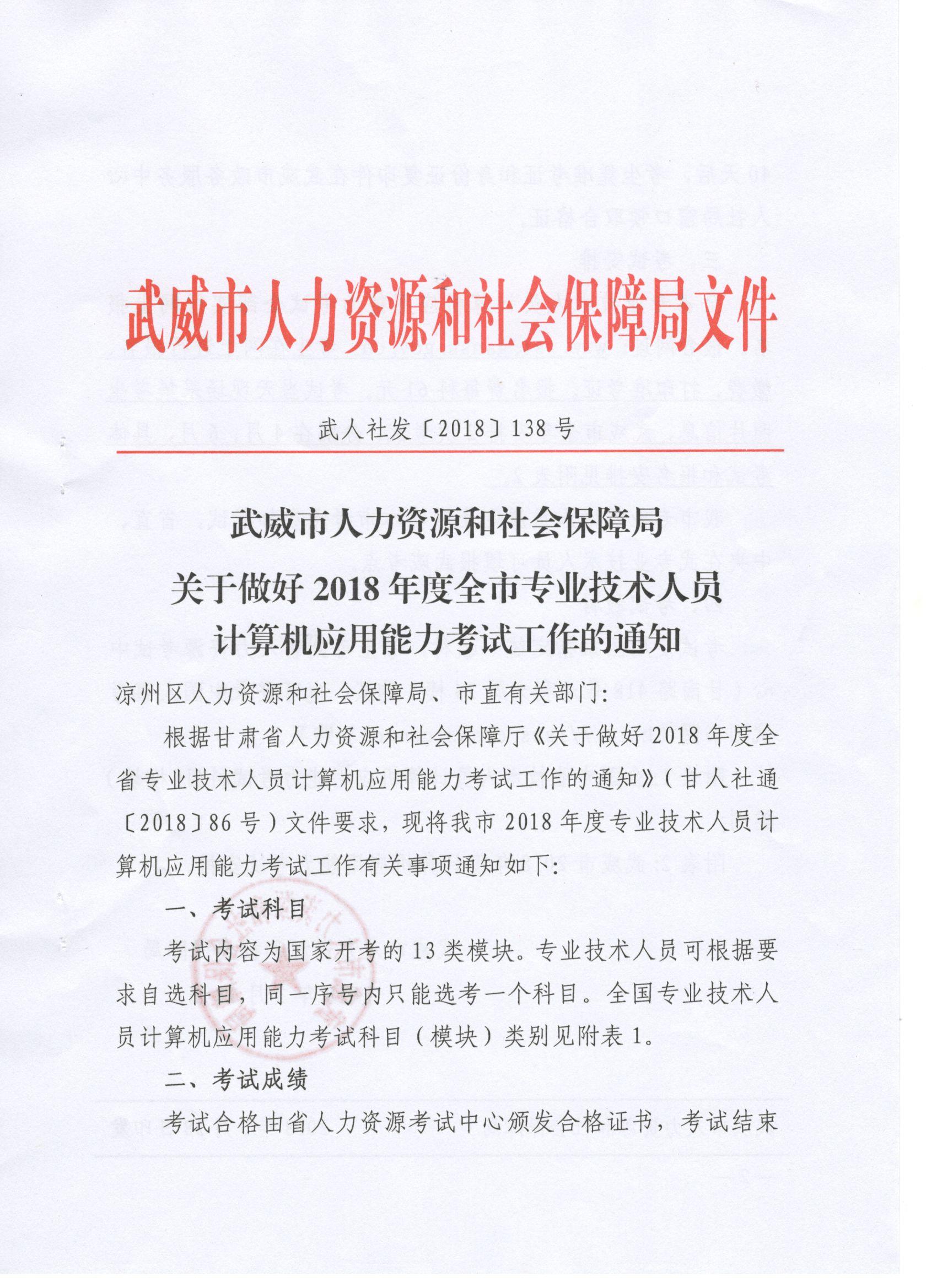 <轉>武威市人力資源和社會保障局關于做好2018年度全市專業(yè)技術人員計算機應用能力考試工作的通知(武人社發(fā)〔2018〕138號 )