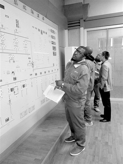 圖為該校2012級赤道幾內(nèi)亞留學(xué)生在故縣水利樞紐電站中控室進(jìn)行運(yùn)行實(shí)習(xí)。