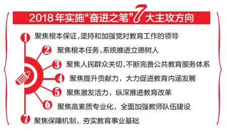 陳寶生指出,黨的十九大對教育工作作出了全面系統(tǒng)部署。在加快教育現(xiàn)代化、建設教育強國的新征程中,解決教育發(fā)展不平衡不充分的問題將是我們長期要面對的工作主題。要以問題為導向,將其作為實施“奮進之筆”的著力點和主攻方向。一是聚焦根本保證,堅持和加強黨對教育工作的領導。要把黨的政治建設擺在首位,狠抓大抓基層黨組織建設,持之以恒正風肅紀,抓好意識形態(tài)工作。二是聚焦根本任務,系統(tǒng)推進立德樹人。要把德育擺在更加重要的位置,堅定青少年理想信念,改進和加強思想政治工作,大力發(fā)展素質(zhì)教育,加強語言文字工作。三是聚焦人民群眾關切,不斷完善公共教育服務體系。要促進學前教育普惠健康發(fā)展,加快城鄉(xiāng)義務教育一體化發(fā)展步伐,加大普及高中階段教育攻堅力度,加大對困難地區(qū)扶持力度,切實加強校園安全。四是聚焦提升貢獻力,大力促進教育內(nèi)涵發(fā)展。要以質(zhì)量為本,持續(xù)推進職業(yè)教育質(zhì)量提升,健全高等教育內(nèi)涵發(fā)展政策機制,辦好繼續(xù)教育。五是聚焦激發(fā)活力,縱深推進教育改革。要深化“放管服”改革,實施考招改革“拓展深化”攻堅行動,支持和規(guī)范社會力量興辦教育,堅定不移以開放促改革。六是聚焦高素質(zhì)專業(yè)化,全面加強教師隊伍建設。實施教師隊伍“建設改革”攻堅行動,健全師德師風建設長效機制,完善教師管理制度,提升教師獲得感、幸福感和榮譽感。七是聚焦保障機制,夯實教育事業(yè)基礎。要落實教育投入責任,加快教育信息化步伐,全力推進依法治教。