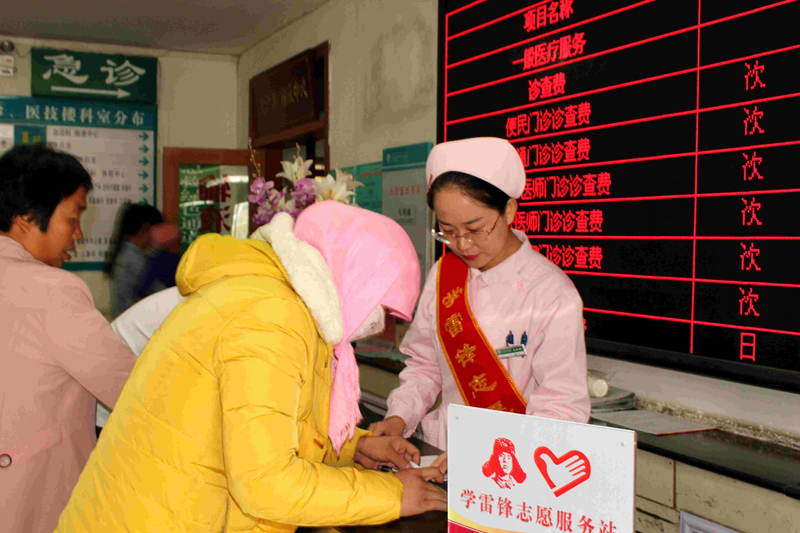 學(xué)雷鋒志愿服務(wù)站工作人員主要由年輕護(hù)士們擔(dān)任。她們身著護(hù)士裝,佩戴印有“學(xué)雷鋒志愿者服務(wù)”字樣綬帶,主動(dòng)為患者服務(wù)。志愿者們提供的主要服務(wù)項(xiàng)目有:在門(mén)診為老、弱、病、殘、孕等患者提供輪椅擔(dān)架租借。為患者提供開(kāi)水、就醫(yī)導(dǎo)診、戒煙勸導(dǎo)、醫(yī)學(xué)人文關(guān)懷、慢性病知識(shí)普及和健康宣教等便民利民服務(wù),受到了患者及家屬的一致好評(píng)。