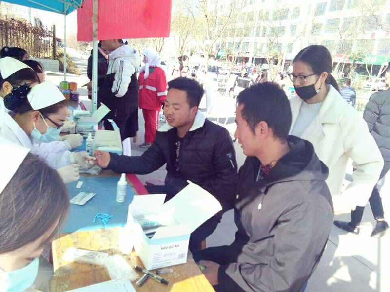 11月17日開始利用周末時(shí)間在武威文化廣場(chǎng)、武威職業(yè)學(xué)院門口等地開展了免費(fèi)檢測(cè)艾滋病與知艾防艾知識(shí)宣傳活動(dòng)。活動(dòng)吸引了廣大師生及路人,組織井然有序,活動(dòng)場(chǎng)面顯得忙而不亂。在護(hù)理系紅絲帶協(xié)會(huì)志愿者與武威市疾控中心人員嫻熟的操作下,通過指尖采血,HIV病毒膠體金法檢測(cè),共檢測(cè)了80余人,檢測(cè)速度快,精準(zhǔn)度高。檢測(cè)結(jié)束后,向檢測(cè)者贈(zèng)送活動(dòng)宣傳紀(jì)念品。此次檢測(cè)活動(dòng)采取保密制,保護(hù)檢測(cè)者的一切信息。