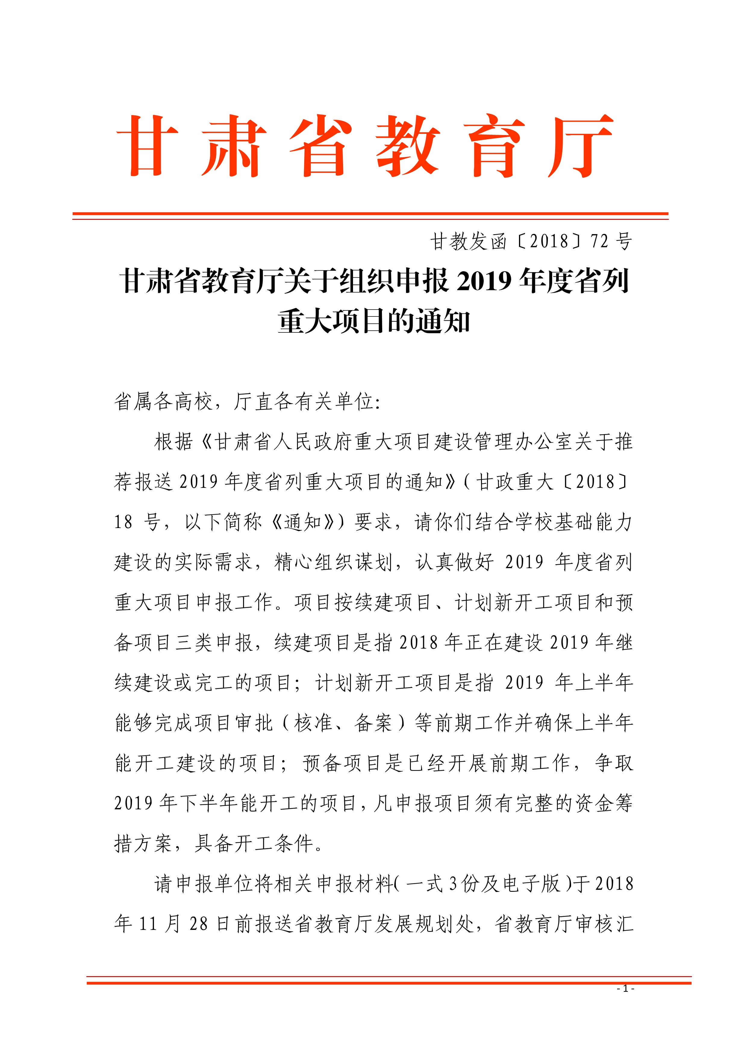 轉發(fā)甘肅省教育廳關于組織申報2019年度省列重大項目的通知