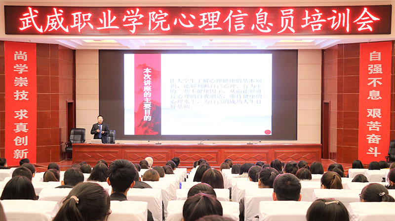 12月4日晚上,學(xué)生工作處聯(lián)合武威市“三社聯(lián)動(dòng)”惠政社區(qū)試點(diǎn)項(xiàng)目在學(xué)院菁英廳舉辦了心理健康專題講座暨心理信息員培訓(xùn)。此次講座邀請(qǐng)武威市心理咨詢師協(xié)會(huì)會(huì)長何飛老師主講,學(xué)院各系輔導(dǎo)員、2017級(jí)、2018級(jí)班級(jí)心理信息員、心翼心理社團(tuán)會(huì)員等220多人聆聽了講座。學(xué)生工作處處長王守云主持活動(dòng)。