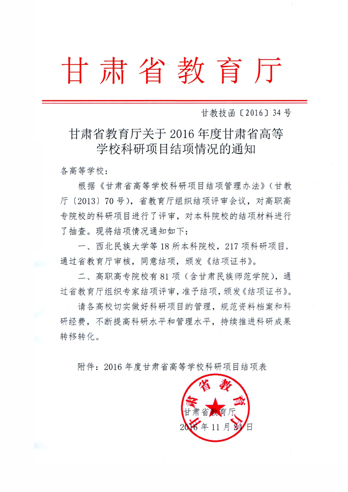 轉(zhuǎn)發(fā)甘肅省教育廳關(guān)于2016年度甘肅省高等學(xué)??蒲许?xiàng)目結(jié)項(xiàng)情況的通知