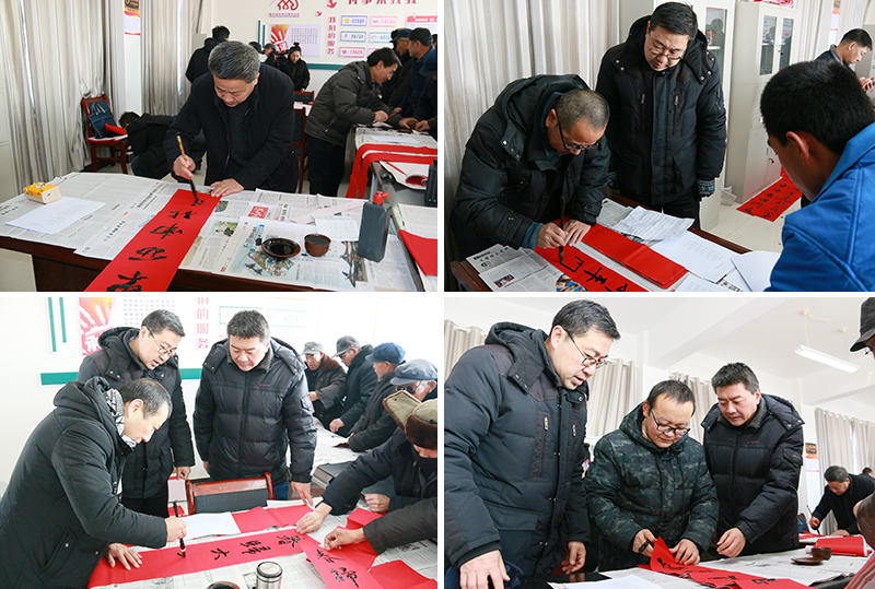 由學(xué)院黨委書記、院長趙明和分管幫扶工作副院長王永緒帶隊(duì),一行50余人到達(dá)西靖鎮(zhèn)8號(hào)移民點(diǎn)、綠洲小城村委會(huì)會(huì)議室后,大家不顧冬日嚴(yán)寒,迅速各司其職、有條不紊地開展各項(xiàng)工作。學(xué)院書法教師們揮毫潑墨,一副副飽含著濃濃年味、寓意吉祥的春聯(lián)躍然紙上,村委會(huì)的會(huì)議室內(nèi)、村民廣場里四處洋溢著墨香的味道,桌子上、村民手里,到處都是大紅的對聯(lián)和“?!弊?,不少村民還主動(dòng)要求在春聯(lián)里寫上新時(shí)代精神和精準(zhǔn)扶貧的內(nèi)容,表達(dá)他們對黨和政府的深深感激之情。幫扶干部還為1號(hào)、3號(hào)、4號(hào)、8號(hào)、9號(hào)移民點(diǎn)的幫扶戶將寫好的春聯(lián)、書畫作品及新春的祝福送到了幫扶戶村民家中。
