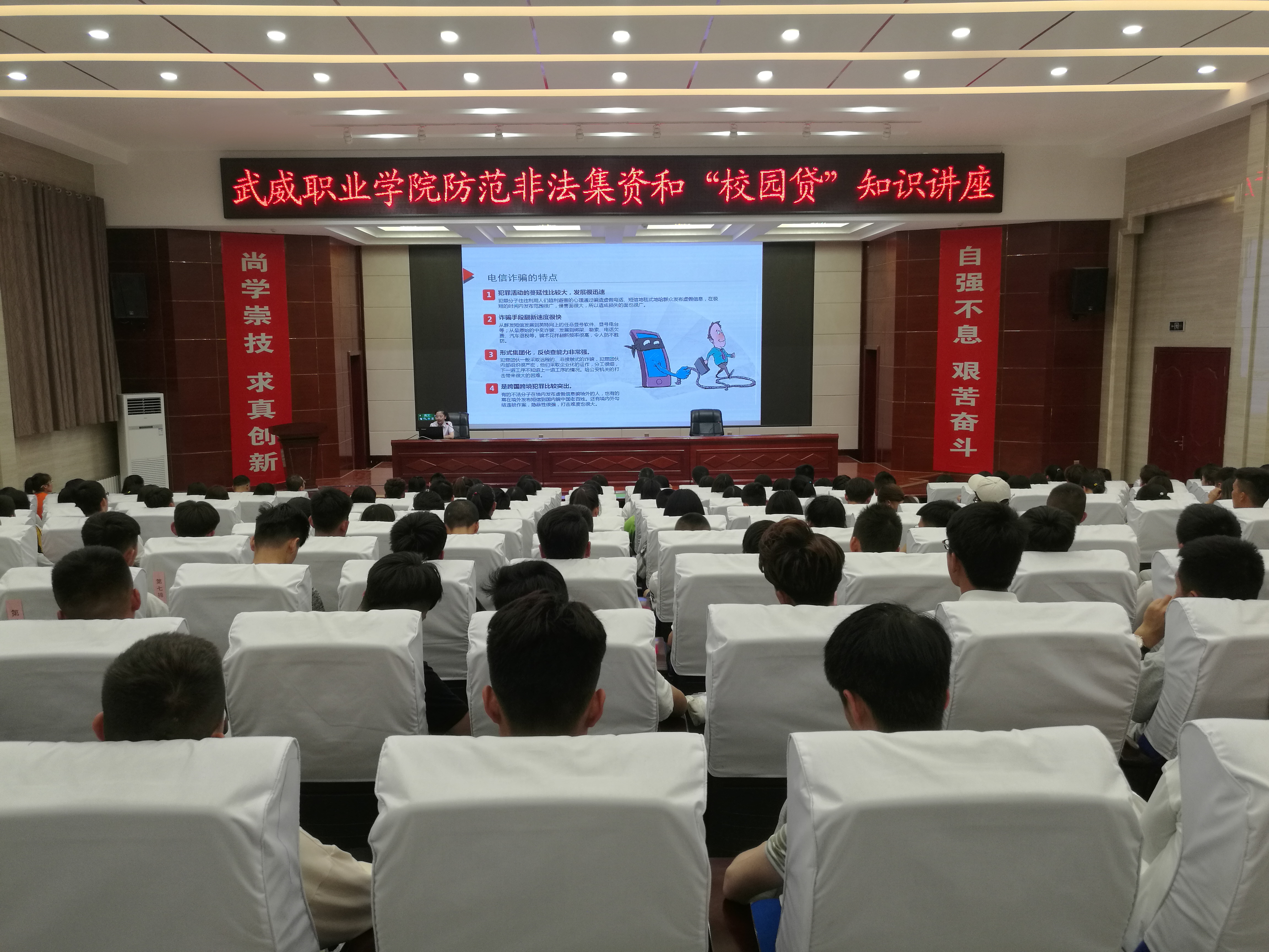 為深入貫徹落實(shí)甘肅省2019年防范非法集資和金融領(lǐng)域掃黑除惡宣傳月活動(dòng)的有關(guān)精神,保護(hù)廣大師生的合法權(quán)益。6月9日晚,學(xué)院邀請中國農(nóng)業(yè)銀行武威支行風(fēng)險(xiǎn)管理部工作人員朱琳在學(xué)院菁英廳作了關(guān)于防范非法集資和校園貸知識(shí)講座,學(xué)院副院長王永緒出席活動(dòng),保衛(wèi)處、計(jì)劃財(cái)務(wù)處負(fù)責(zé)同志及各系師生代表200余人聆聽了講座。