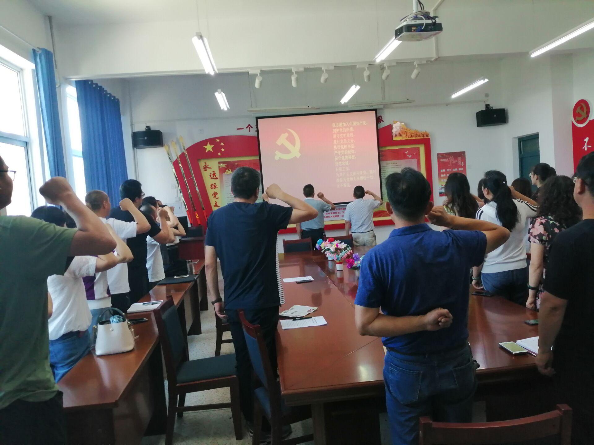 黨總支書記胡靜峰宣讀了中國(guó)共產(chǎn)黨預(yù)備黨員名單。在胡靜峰同志帶領(lǐng)下預(yù)備黨員面向黨旗進(jìn)行了入黨宣誓,其他黨員重溫了入黨誓詞。預(yù)備黨員劉心代表預(yù)備黨員進(jìn)行了表態(tài)發(fā)言。
