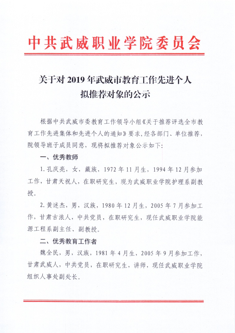 關(guān)于對2019年武威市教育工作先進(jìn)個(gè)人擬推薦對象的公示