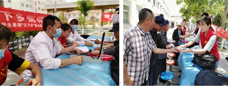 醫(yī)療服務(wù)團每到一個服務(wù)點,當(dāng)?shù)氐拇迕穸紩吁喽鴣?,愛心醫(yī)療服務(wù)團的隊員顧不上休息就迅速投入到診療服務(wù)中,對于每位咨詢及就診的群眾,老師和隊員都是熱情認真、耐心細致、深入淺出地一一講解。有的志愿者協(xié)助老師為就診群眾測量血壓、血糖,面對血壓和血糖偏高的老人,告之他們檢查指標(biāo)偏高的危險,提醒他們聽從醫(yī)囑按時服藥,有的志愿者進村入戶,發(fā)放〈夏季常見病防治知識〉宣傳單,開展醫(yī)療衛(wèi)生知識宣傳教育活動,幫助村民提高自我保健意識,尤其是對一些常見病、多發(fā)病的認識,以便做到早發(fā)現(xiàn)、早診斷、早治療?;顒又谐肆x診和宣教,還教會了部分居民針對呼吸心跳驟停病人盡快施行心肺復(fù)蘇(CPR)的現(xiàn)場應(yīng)急救護技術(shù)。