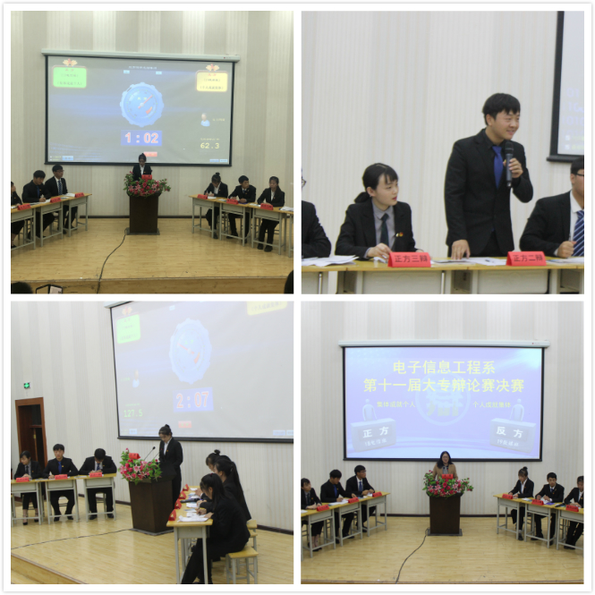 11月11日進(jìn)行了“集體成就個(gè)人”和“個(gè)人成就集體”為主題的辯論賽決賽。本次辯論賽共分為開篇立論、攻辯、攻辯小結(jié)、自由辯論、總結(jié)陳詞五個(gè)環(huán)節(jié)。在整個(gè)比賽中,雙方辯手爭鋒相對,步步緊逼,在最精彩的自由辯論環(huán)節(jié),選手你來我往,旁征博引,臺(tái)下掌聲不斷。經(jīng)過緊張而又激烈的角逐, 18電子信息工程技術(shù)大專班以精彩的表現(xiàn)獲得了辯論賽的冠軍。