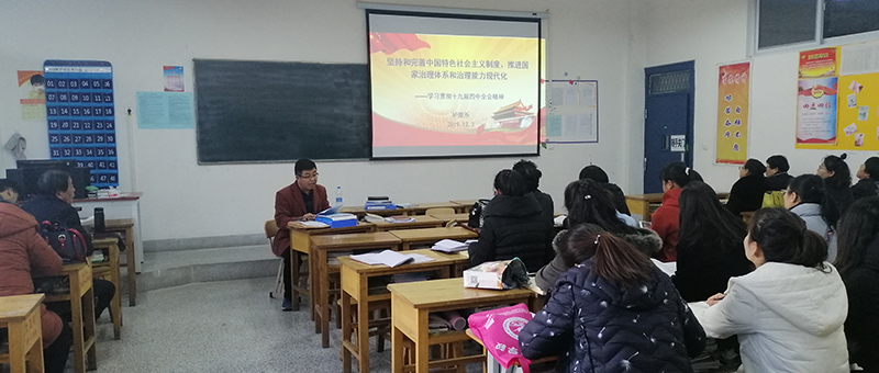 12月3日下午,護(hù)理系在明遠(yuǎn)樓214教室召開(kāi)宣講黨的十九屆四中全會(huì)精神報(bào)告會(huì),系黨總支書(shū)記張建輝同志以《堅(jiān)持和完善中國(guó)特色社會(huì)主義制度、推進(jìn)國(guó)家治理體系和治理能力現(xiàn)代化》為題進(jìn)行宣講,全系教師聆聽(tīng)了本次報(bào)告會(huì)。