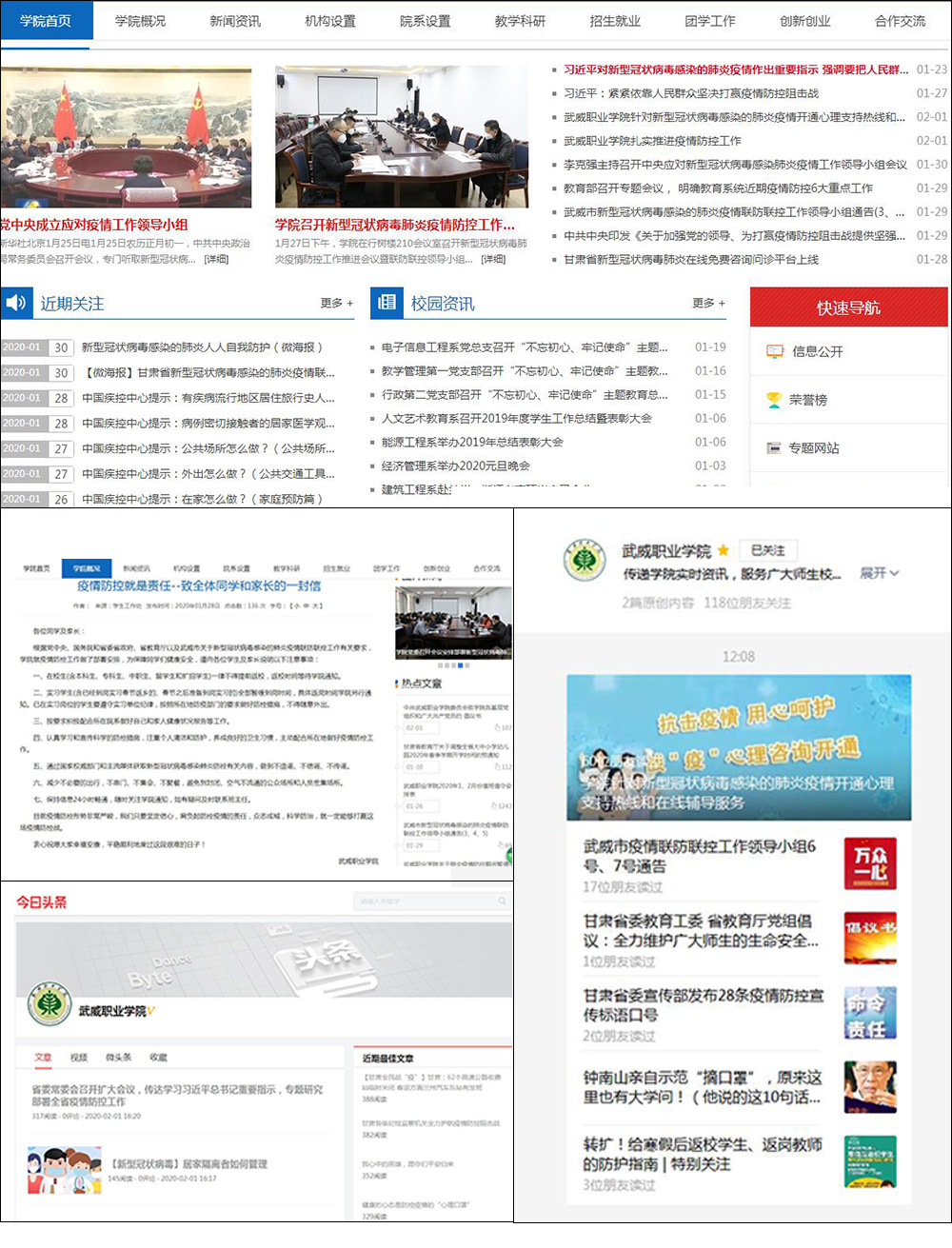 學(xué)院通過網(wǎng)站、微信公眾號(hào)、隴政釘、微信群、QQ群等平臺(tái),第一時(shí)間刊載轉(zhuǎn)發(fā)習(xí)近平總書記重要指示、李克強(qiáng)總理批示,中共中央、教育部、省委、省教育工委、武威市委關(guān)于做好新型冠狀病毒感染肺炎疫情防控工作的重要會(huì)議、文件、通知以及《武威職業(yè)學(xué)院致全體同學(xué)和家長(zhǎng)的一封信》《中共武威職業(yè)學(xué)院委員會(huì)致學(xué)院各基層黨組織和廣大共產(chǎn)黨員的倡議書》和防控知識(shí)50多條;做到宣傳教育和正面引導(dǎo)覆蓋到每一位教師、每一個(gè)班級(jí)、每一位學(xué)生,確保師生和學(xué)生家長(zhǎng)及時(shí)了解疫情發(fā)展態(tài)勢(shì)、臨床癥狀和學(xué)習(xí)掌握防控知識(shí);做到科學(xué)認(rèn)識(shí)、理性判斷、合理應(yīng)對(duì),不信謠、不傳謠,養(yǎng)成健康的防控生活習(xí)慣,堅(jiān)定信心、眾志成城防控疫情、戰(zhàn)勝疫情。