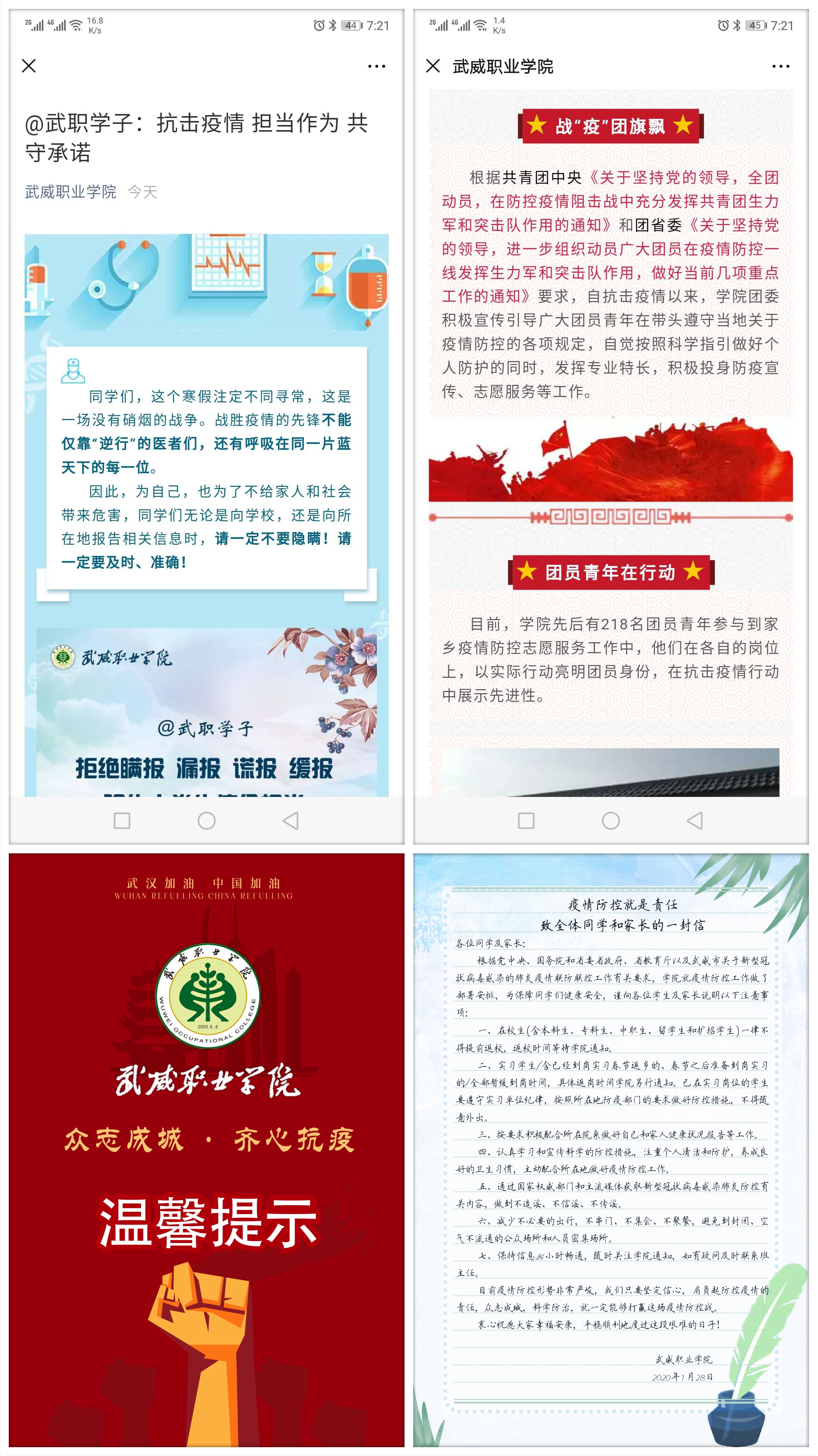 學(xué)生工作處及時(shí)發(fā)布了致學(xué)生和家長的一封信《疫情防控就是責(zé)任》,團(tuán)委制作和推送了《春暖花開疫情散 我們武職再相見》溫馨提示短片和《@武職學(xué)子:抗擊疫情 擔(dān)當(dāng)作為 共守承諾》倡議,用生動(dòng)形象的表述要求和提醒同學(xué)們不得提前返校,做好個(gè)人防護(hù)措施,遵守當(dāng)?shù)匾咔榉揽馗黜?xiàng)要求,做到不信謠不傳謠,及時(shí)向?qū)W院報(bào)送個(gè)人防疫相關(guān)信息,不瞞報(bào)不慌報(bào)。各院系輔導(dǎo)員和班主任都會(huì)第一時(shí)間在學(xué)生群里轉(zhuǎn)發(fā),同時(shí)把學(xué)院網(wǎng)站和微信平臺(tái)上科學(xué)的防控知識(shí)和上級(jí)的有關(guān)精神及時(shí)傳達(dá)給學(xué)生,當(dāng)好疫情防控的宣傳員,做到戰(zhàn)疫有“力”。