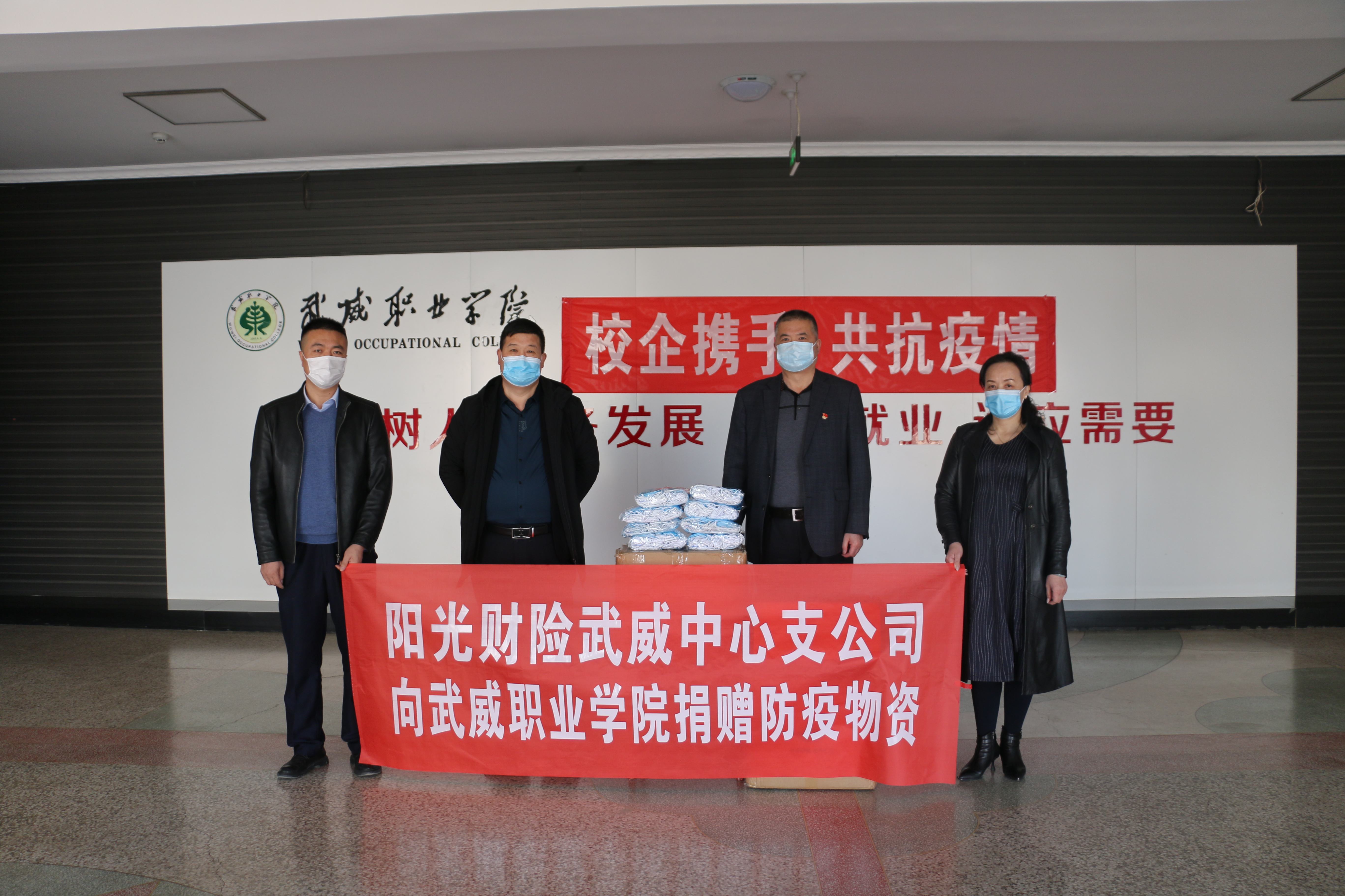 3月16日下午,陽光財(cái)產(chǎn)保險(xiǎn)股份有限公司武威中心支公司向?qū)W院捐贈(zèng)愛心防疫物資儀式在行樹樓大廳舉行,學(xué)院副院長王守云、陽光財(cái)產(chǎn)保險(xiǎn)股份有限公司武威中心支公司總經(jīng)理崔生輝、學(xué)院后勤處負(fù)責(zé)同志參加捐贈(zèng)活動(dòng)。