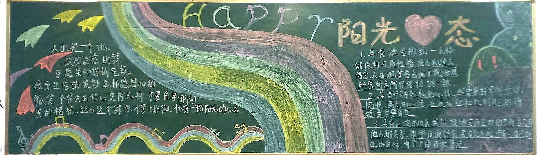 為進(jìn)一步提高大學(xué)生的心理素質(zhì),促進(jìn)大學(xué)生的身心健康和諧,宣傳普及心理健康知識,深入開展心理健康教育,我系結(jié)合學(xué)院特點(diǎn),突出專業(yè)優(yōu)勢,在積極承擔(dān)和參與學(xué)校心理健康活動月的團(tuán)日活動的同時,各班開展了豐富多彩的以“心理健康”為主題的黑板報(bào)。