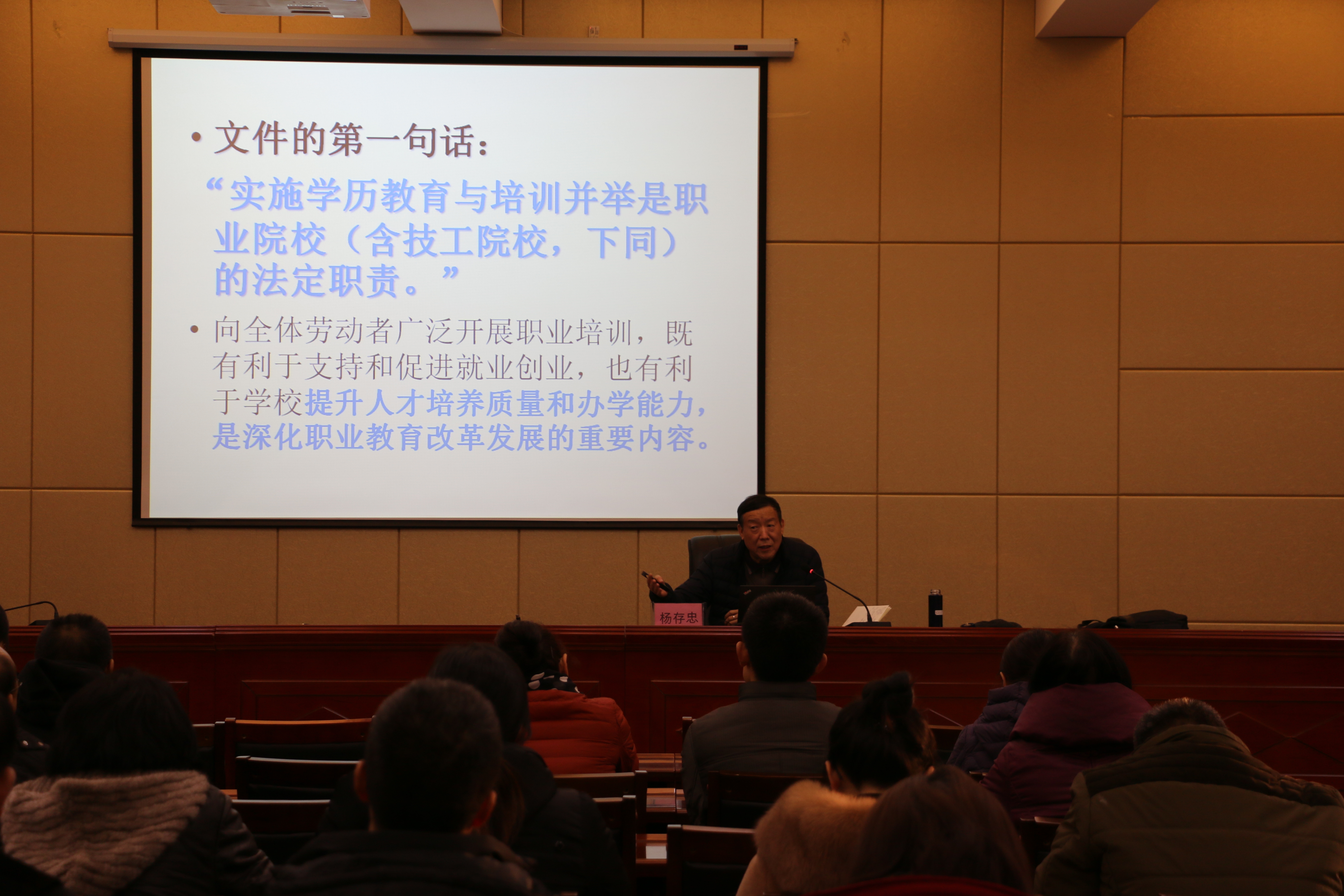 針對教育部11月25日發(fā)布的“關于做好《職業(yè)院校全面開展職業(yè)培訓 促進就業(yè)創(chuàng)業(yè)行動計劃》實施工作有關事項的通知”的文件(以下簡稱《行動計劃》),楊教授從《行動計劃》出臺的背景和意義、職業(yè)院校的法定職責、職業(yè)院校普遍存在的問題、《行動計劃》對職業(yè)院校提出的重點任務和行動措施以及如何推進貫徹落實《行動計劃》等五個方面和大家進行了學習分享。楊教授強調,深化職業(yè)教育改革發(fā)展,職業(yè)院校敞開校門,廣泛開展培訓工作,服務社會發(fā)展,是職業(yè)院校的法定責任,也是學院可持續(xù)發(fā)展和生存的必然趨勢?!缎袆佑媱潯穼β殬I(yè)院校提出了十個方面的行動措施一是廣泛開展企業(yè)職工技能培訓。二是積極開展面向重點人群的就業(yè)創(chuàng)業(yè)培訓。三是大力開展失業(yè)人員再就業(yè)培訓。四是做好職業(yè)指導和就業(yè)服務。五是推進培訓資源建設和模式改革。六是加強培訓師資隊伍建設。七是支持多方合作共建培訓實訓基地。八是完善職業(yè)院校開展培訓的激勵政策。九是健全參訓人員的支持鼓勵政策。十是建立培訓評價與考核機制。楊教授希望大家能夠學好文件并認真思考學院的改革發(fā)展。把立德樹人、服務發(fā)展、促進就業(yè)、適應需求的辦學理念傳承下去。