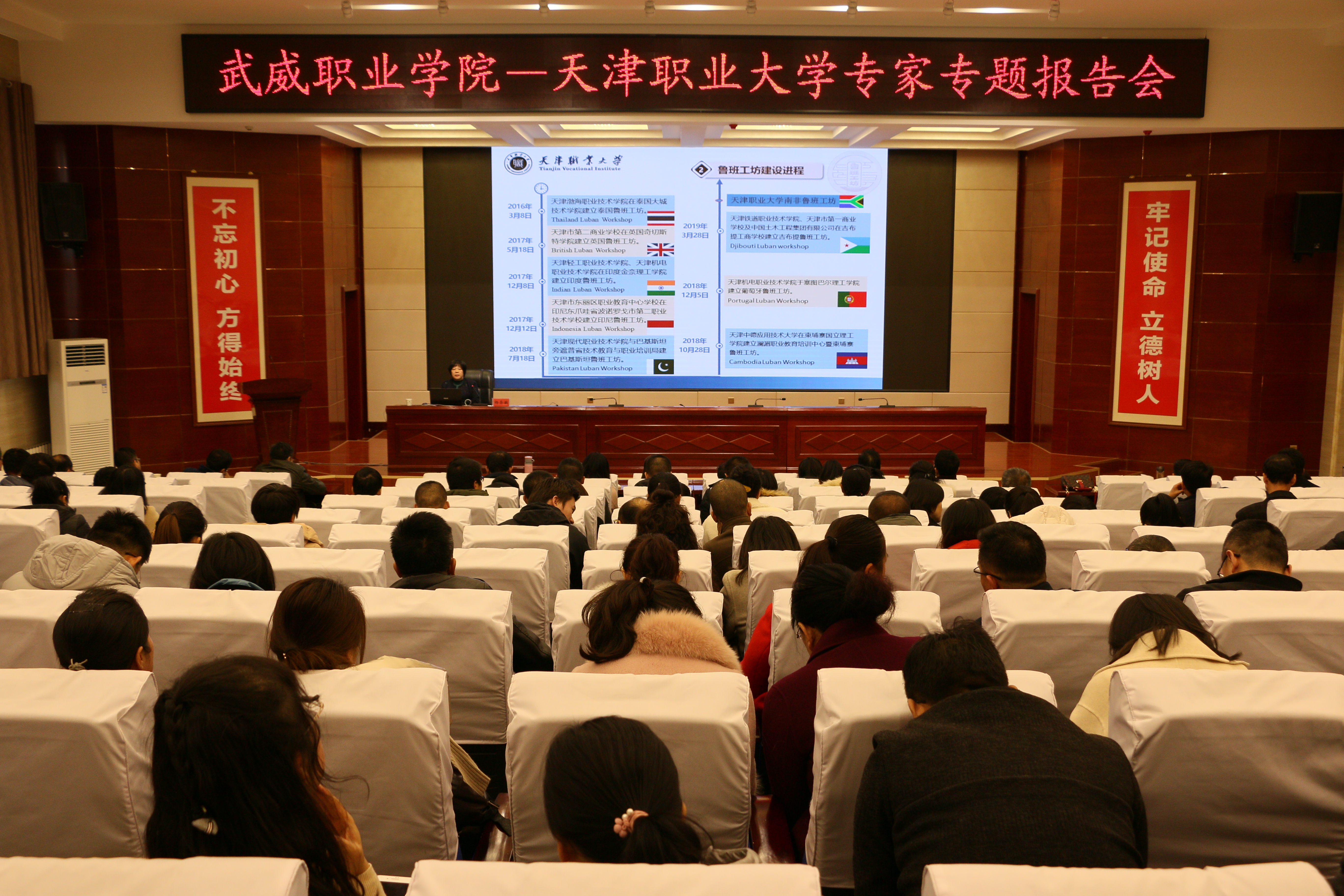 11月20日上午,武威職業(yè)學(xué)院“綠洲講壇”第28期在學(xué)院菁英廳舉行,本期活動(dòng)邀請(qǐng)到天津職業(yè)大學(xué)校長(zhǎng)楊榮敏作主題為“魯班工坊—中國(guó)職業(yè)教育國(guó)際知名品牌”的報(bào)告。學(xué)院領(lǐng)導(dǎo)班子、中層干部、教師代表220余人參加了報(bào)告會(huì)。本期講壇由學(xué)院黨委書記、院長(zhǎng)趙明主持。
