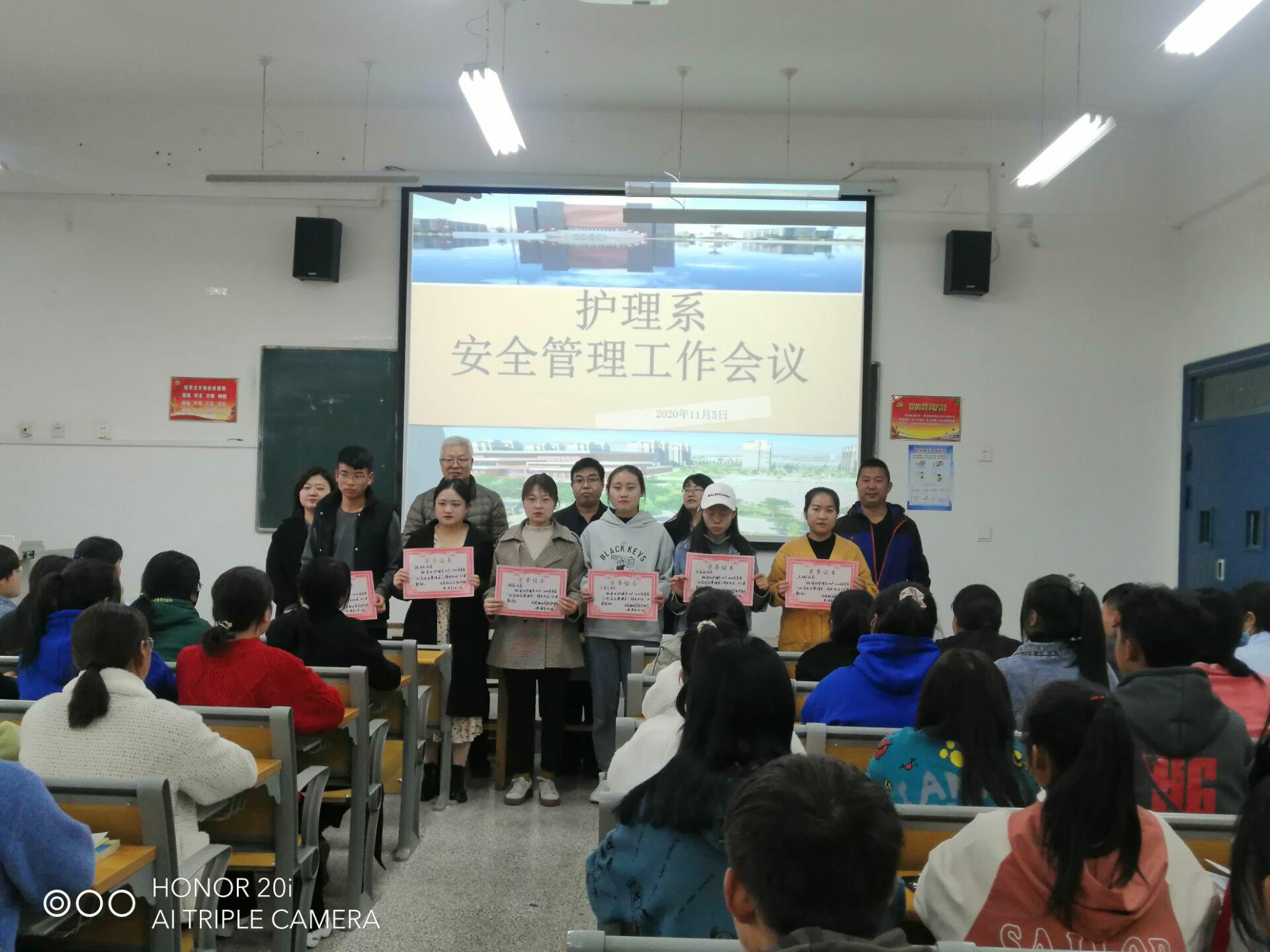 會上,陳鳳平宣讀了《護理系關于表彰2019-2020學年度學生優(yōu)秀安全管理員的決定》,護理系書記張建輝為獲表彰學生頒發(fā)榮譽證書。張學軍就近期我系存在的安全隱患問題作了詳細的說明。張建輝傳達了學院召開的疫情常態(tài)化防控工作會議內容及相關文件精神,他指出,全系要進一步加強安全隱患排查,尤其是實驗室安全,切實將安全各項工作措施落到實處,預防安全事故的發(fā)生。他強調,全系師生要進一步加強學生身體健康監(jiān)測,尤其是每天的晨午檢、日報告、零報告,切實將疫情防控各項工作措施落到實處;倡導文明就餐,增強節(jié)約意識,實施“光盤行動”,杜絕浪費發(fā)生; 持續(xù)做好宿舍、教室及環(huán)境衛(wèi)生掃除,營造良好的學習、生活和工作環(huán)境;安全是所有工作的基礎與保障,全體安全員要齊心協(xié)力、攜手努力,除隱患、防火險、保安全、促和諧,為建設美好校園戮力奮進。