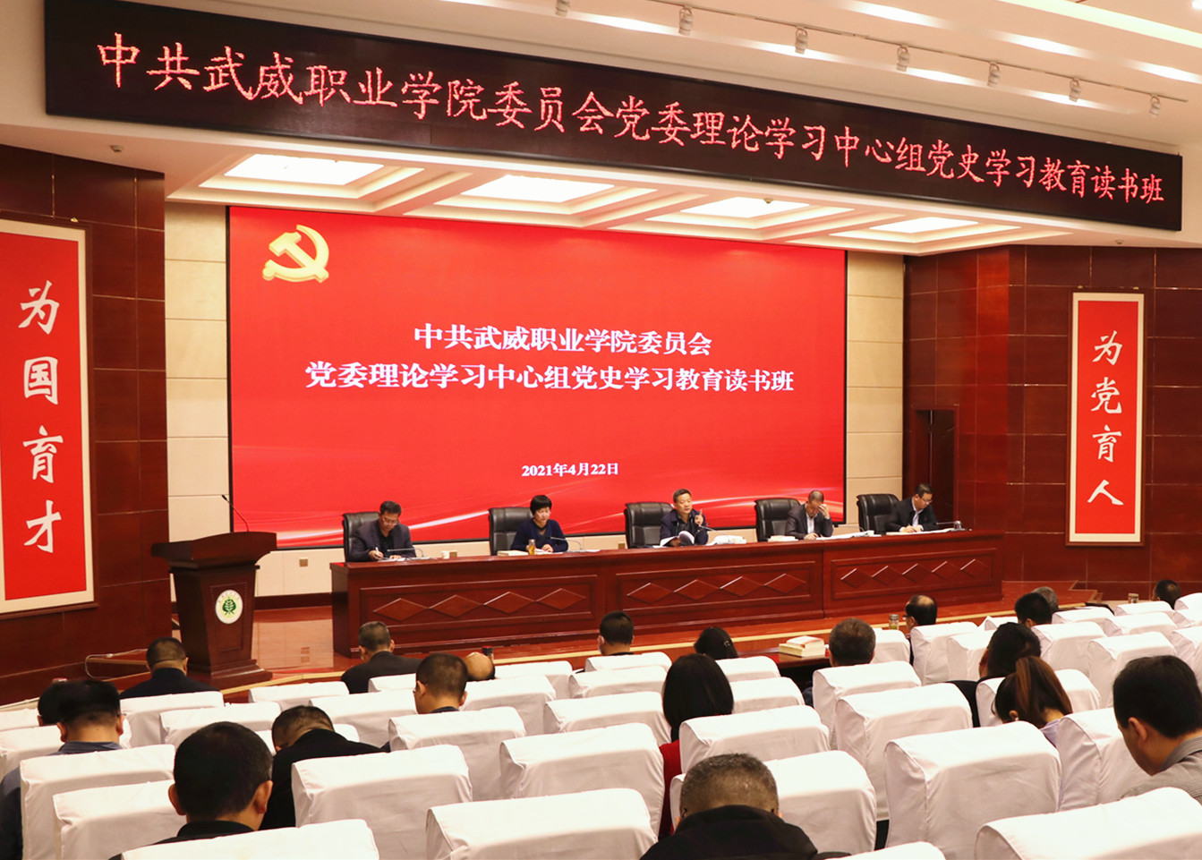 正值第26個(gè)“世界讀書(shū)日”到來(lái)之際,4月22上午,學(xué)院黨委理論學(xué)習(xí)中心組黨史學(xué)習(xí)教育讀書(shū)班暨學(xué)習(xí)(擴(kuò)大)會(huì)議在大學(xué)生活動(dòng)中心菁英廳舉行。學(xué)院領(lǐng)導(dǎo)班子成員、全體中層干部、各基層黨組織書(shū)記、專(zhuān)職組織員和支委委員共100人參加讀書(shū)班學(xué)習(xí)。黨委書(shū)記、院長(zhǎng)趙明主持開(kāi)班式并講話。