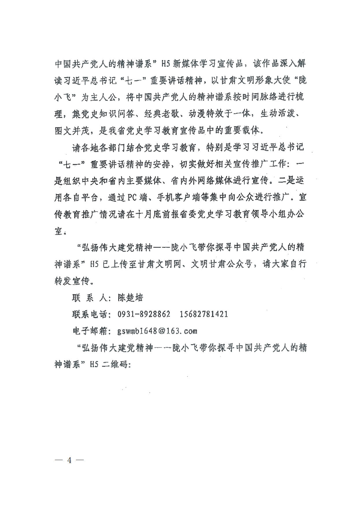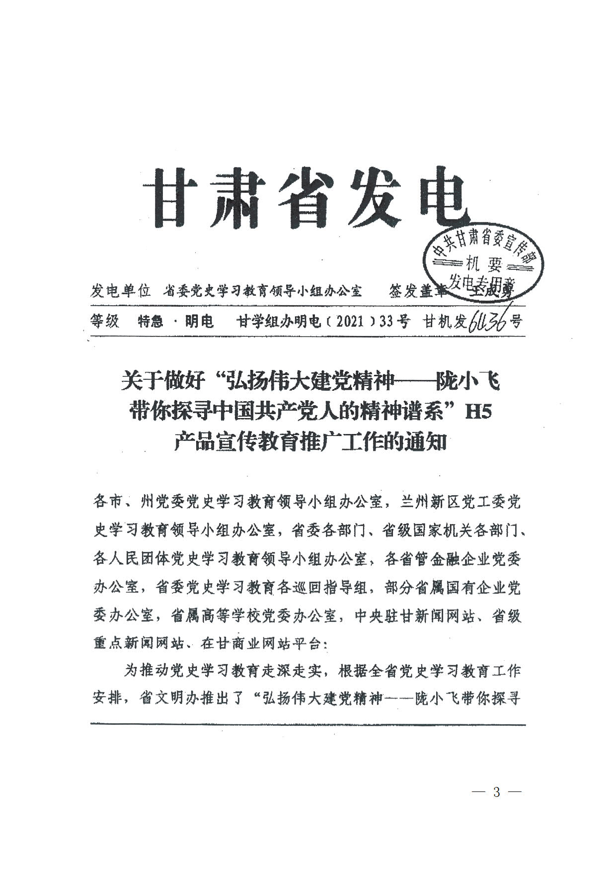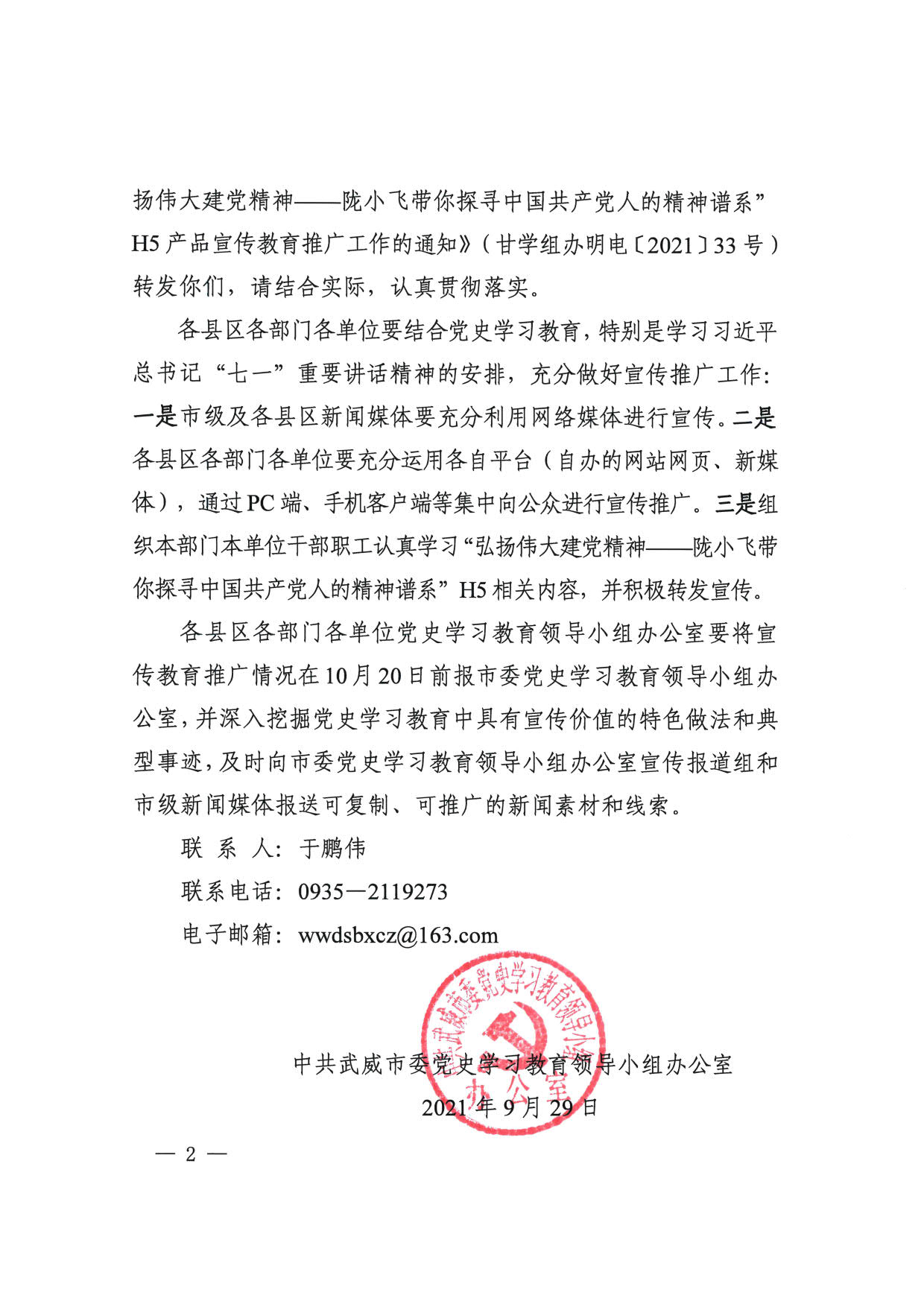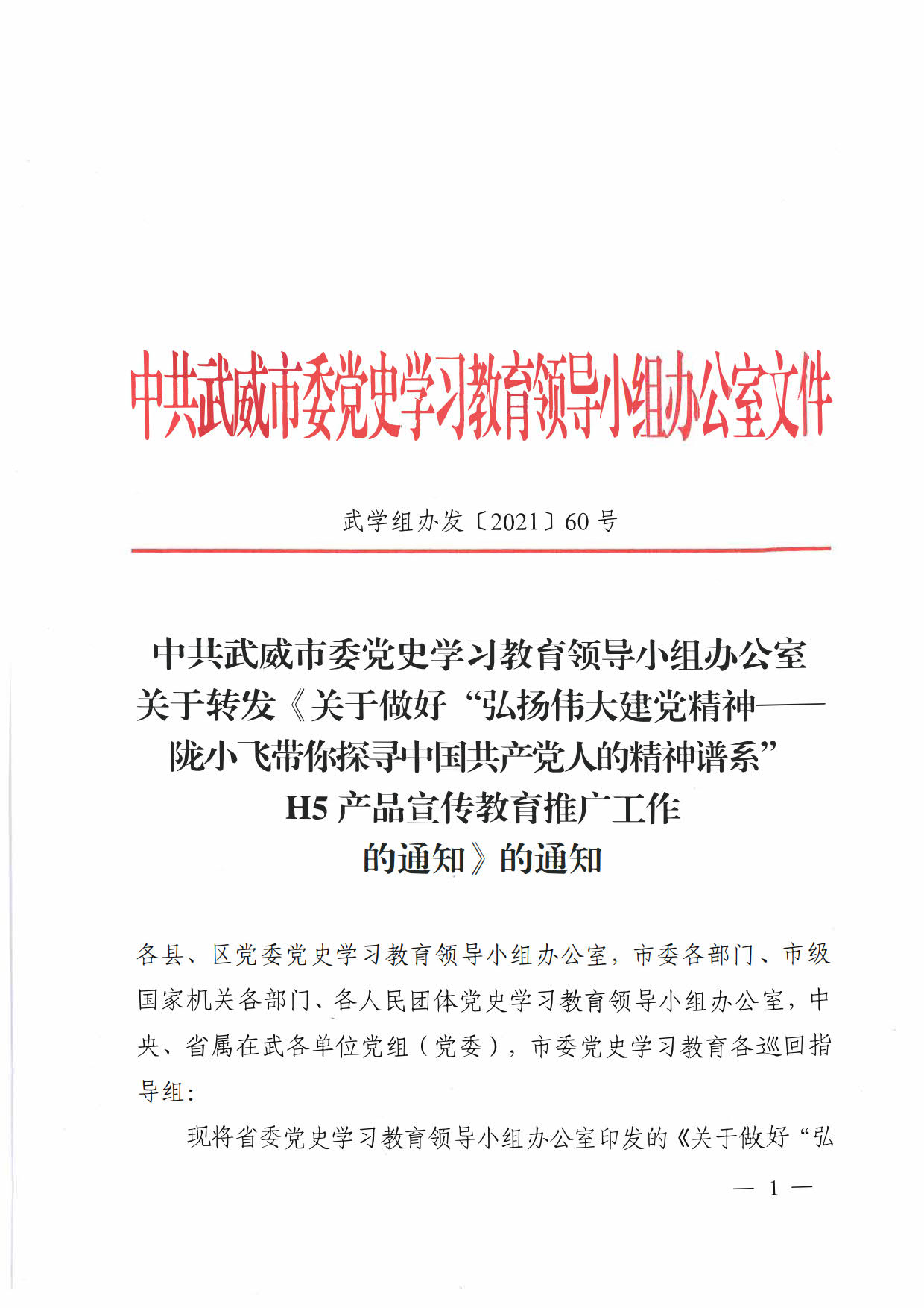 中共武威市委黨史學習教育領(lǐng)導小組辦公室關(guān)于轉(zhuǎn)發(fā)〈關(guān)于做好 “弘揚偉大建黨精神——隴小飛帶你探尋中國共產(chǎn)黨人的精神譜系”H5產(chǎn)品宣傳教育推廣工作的通知〉的通知