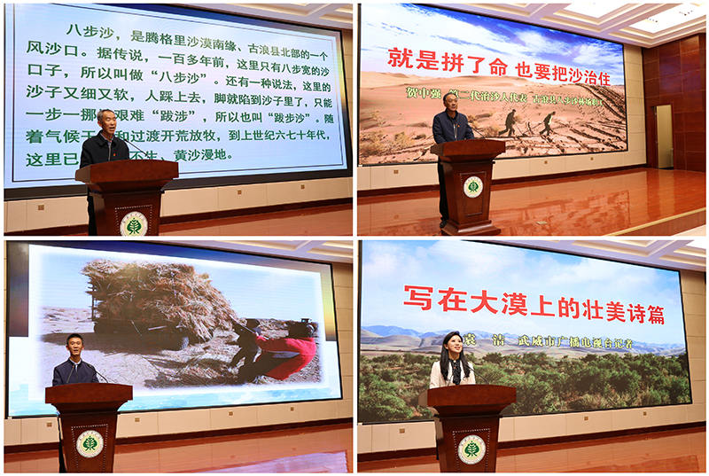 報(bào)告會(huì)上,二代治沙人代表、八步沙林場(chǎng)場(chǎng)長(zhǎng)郭萬剛,二代治沙人代表、八步沙林場(chǎng)職工賀中強(qiáng),三代治沙人、八步沙林場(chǎng)管護(hù)員郭璽、武威市廣播電視臺(tái)記者袁潔,分別從綠色承諾、使命責(zé)任、接續(xù)奮斗、記者見證等不同角度、不同側(cè)面,生動(dòng)再現(xiàn)了“六老漢”三代人治沙造林持續(xù)改善生態(tài)環(huán)境、讓沙漠披綠生金的感人事跡。在場(chǎng)師生無不為“六老漢”三代人的感人事跡深深震撼,紛紛表示要學(xué)習(xí)和繼承“六老漢”三代人困難面前不低頭、敢把沙漠變綠洲的奮斗精神,為建設(shè)美麗中國(guó)、實(shí)現(xiàn)中華民族永續(xù)發(fā)展貢獻(xiàn)自己的青春力量。