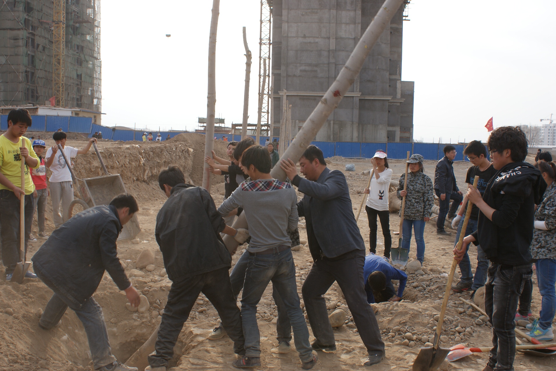 植樹(shù)現(xiàn)場(chǎng)一派忙碌的景象,大家有秩序地領(lǐng)取工具,三五一組,分工明確,揮動(dòng)鎬頭,掘土挖坑,再將一顆顆樹(shù)苗埋窩、培土、踩實(shí)、澆灌。經(jīng)過(guò)三天的緊張勞作,我系師生在指定區(qū)域完成了280個(gè)樹(shù)坑的開(kāi)挖和樹(shù)木栽植任務(wù)。