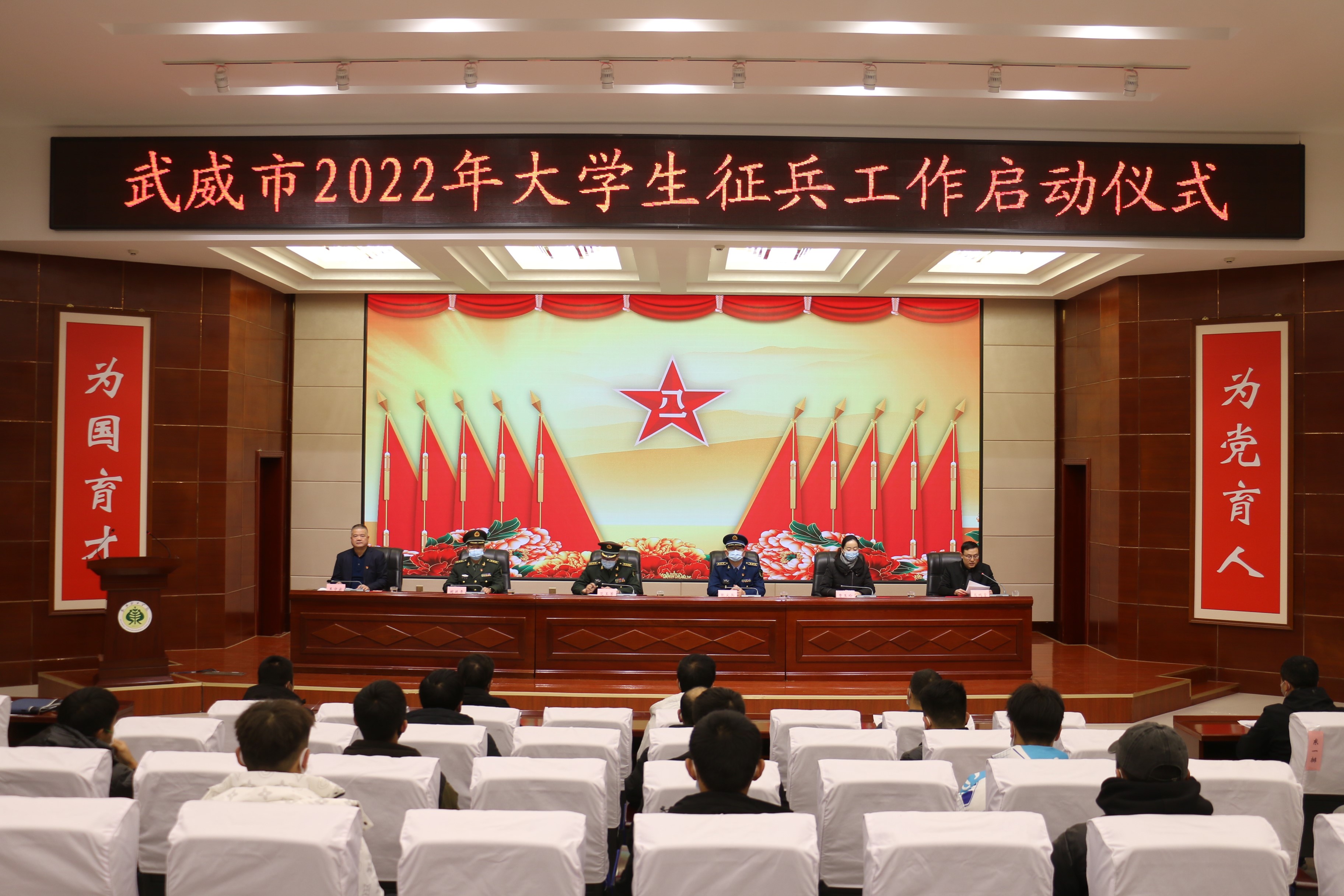 12月29日下午,武威市2022年大學生征兵工作啟動儀式在我院舉辦。武威軍分區(qū)司令員范玉芳、武威軍分區(qū)動員處處長張尖兵、武威市教育局副局長賈玉玲、涼州區(qū)人武部部長闞延貴,學院黨委委員、副院長王守云出席會議。學院各院系輔導員、2021年退役復學大學生代表和應征報名學生代表參加了會議。會議由學生工作處負責人高鵬堂主持。會議采取線下進行和線上同步直播的方式召開。