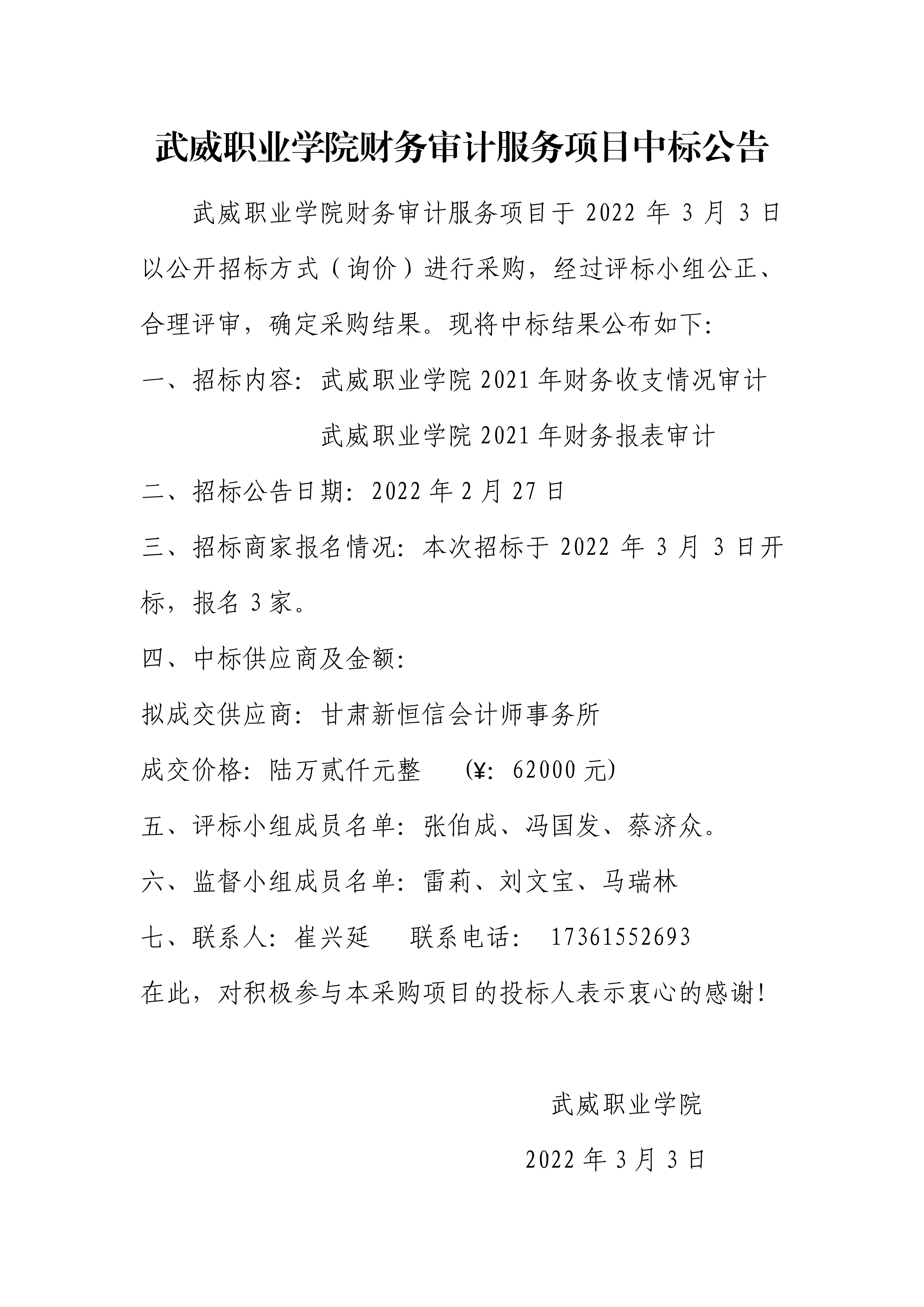 武威職業(yè)學(xué)院財務(wù)審計服務(wù)項目中標公告
