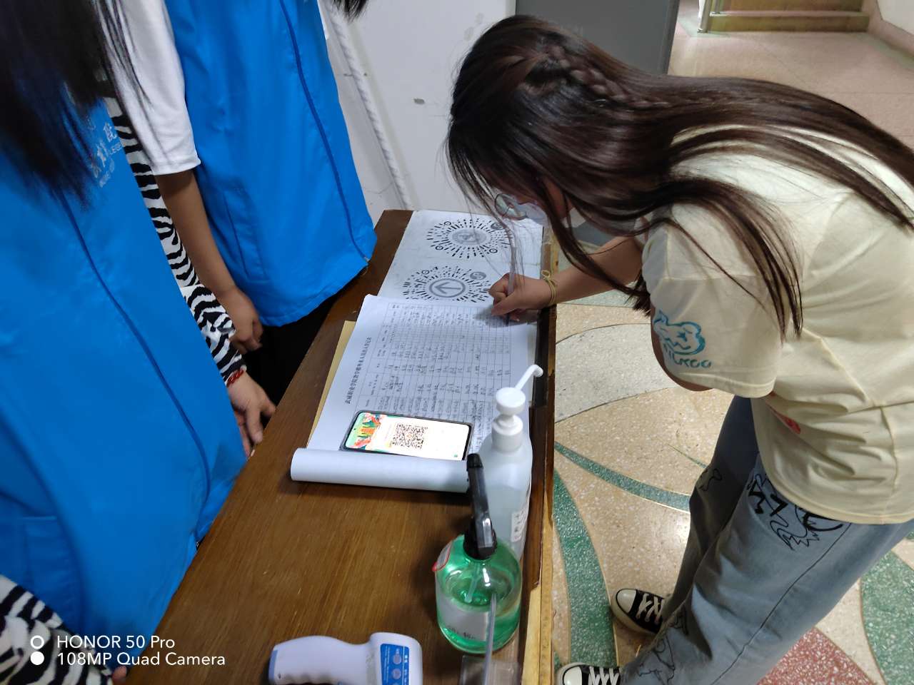“您好,請(qǐng)出示一下您的健康碼、行程碼和核酸檢測(cè)證明,謝謝配合……”“您好,請(qǐng)?jiān)谶@邊做一下登記,謝謝配合?!蔽以嚎挂咧驹刚叻?wù)隊(duì),在食堂門口,水房門口,宿舍樓,教學(xué)樓門口,志愿者們身穿“紅馬甲”,以所在學(xué)院為單元按照疫情期間門禁管理要求開展“疫情防控值班”志愿服務(wù)活動(dòng),凡來訪者一律要求戴口罩,亮健康碼,行程碼,測(cè)量體溫正常后方可通行。