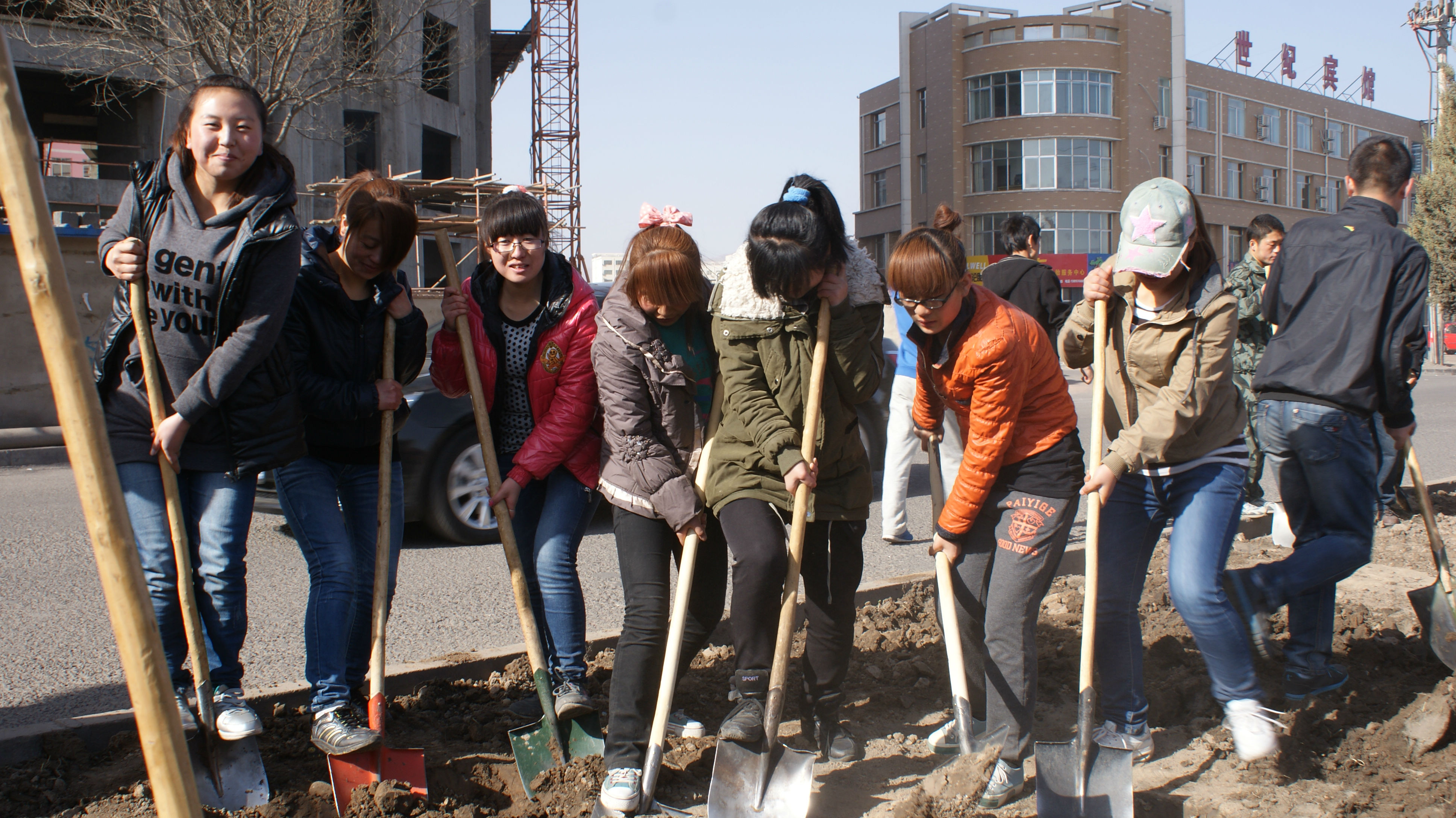 大家早早的來到了目的地,很快投入了植樹和凈化街道的隊伍中。同學們井然有序,手持鐵鍬,一鍬一鍬的鏟土,一片一片的清理大街,干勁十足。同學們無一不閃爍著汗珠,露出幸福的笑容。