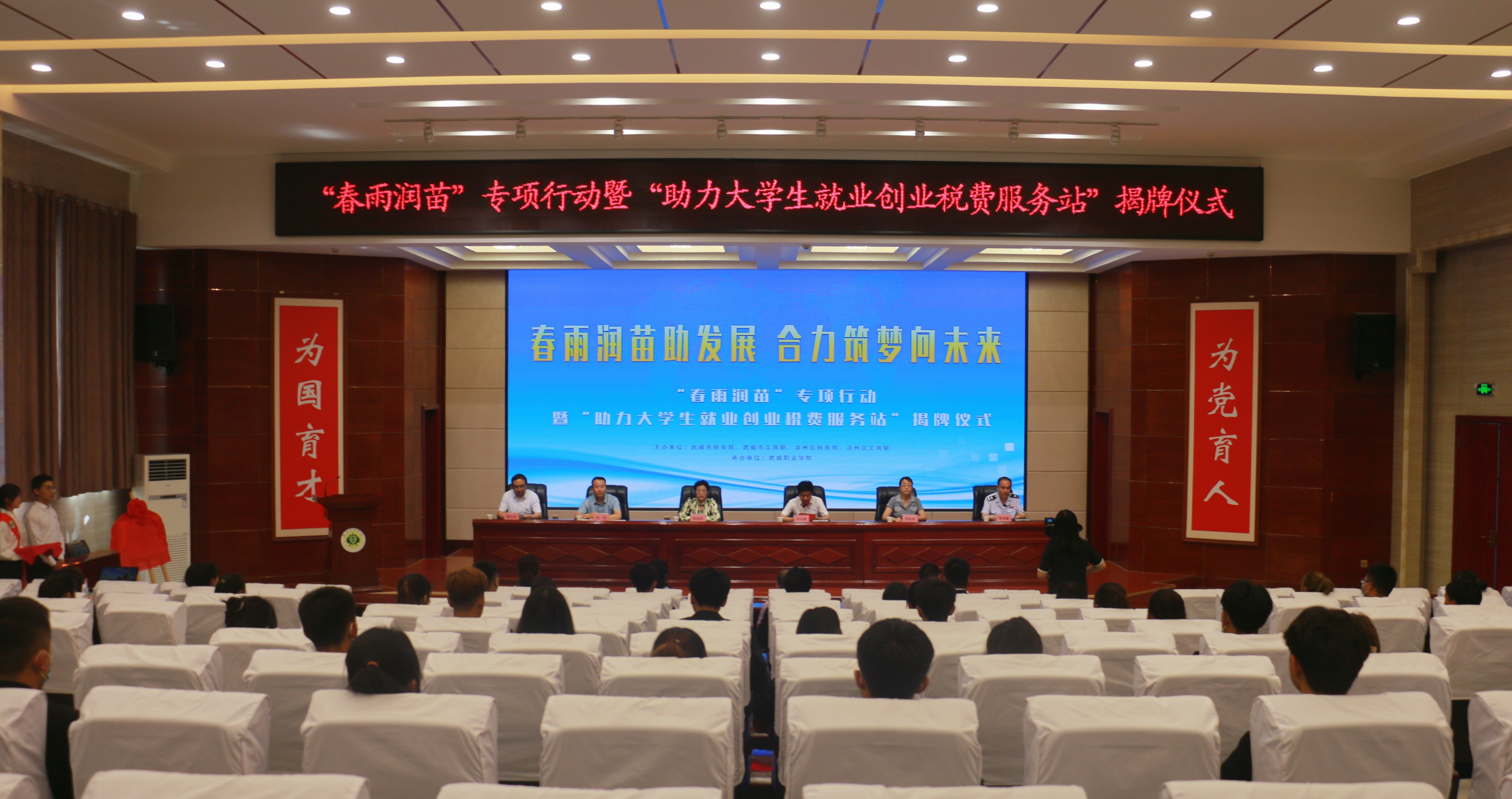 6月10日下午,武威市稅務(wù)局聯(lián)合工商聯(lián)在學(xué)校菁英廳舉辦“春雨潤苗”專項行動暨“助力大學(xué)生就業(yè)創(chuàng)業(yè)稅費服務(wù)站”揭牌儀式。武威市稅務(wù)局黨委委員、副局長劉永德,武威市工商聯(lián)副主席張連科,涼州區(qū)工商聯(lián)副主席唐紅生,學(xué)校黨委委員、副校長田迎春出席揭牌儀式,涼州區(qū)稅務(wù)局黨委委員、副局長李斌盛主持活動。武威市稅務(wù)局黨委委員、副局長劉永德在講話中指出“助力大學(xué)生就業(yè)創(chuàng)業(yè)稅費服務(wù)站”的成立,既是武威稅務(wù)部門優(yōu)化稅費服務(wù)的有力舉措,也是學(xué)院、工商聯(lián)和稅務(wù)的一次深入合作,更是三方匯聚合力,助力穩(wěn)就業(yè)、保民生、促發(fā)展的積極作為。”