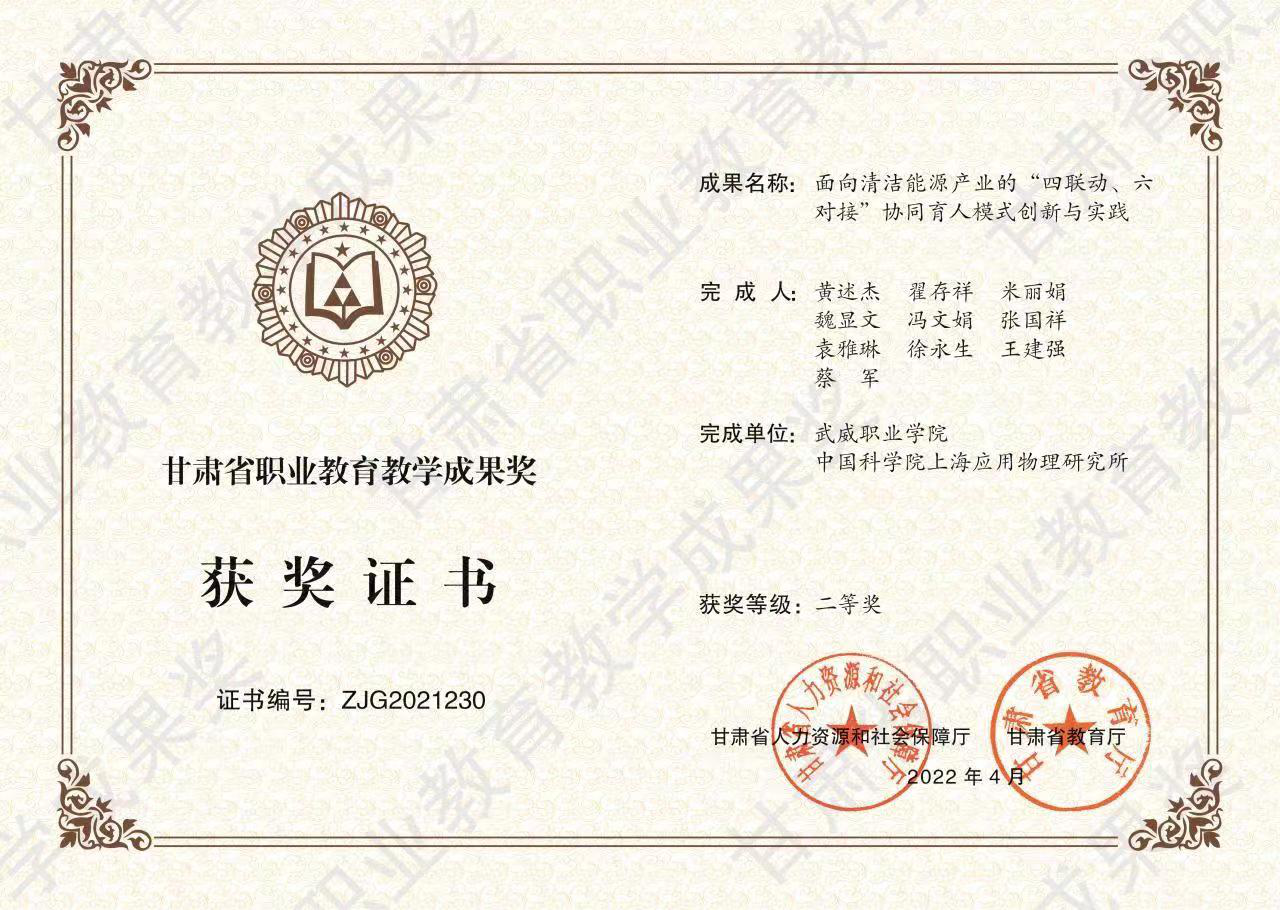 中科低碳新能源技術(shù)學(xué)院榮獲2021年甘肅省職業(yè)教育教學(xué)成果獎二等獎