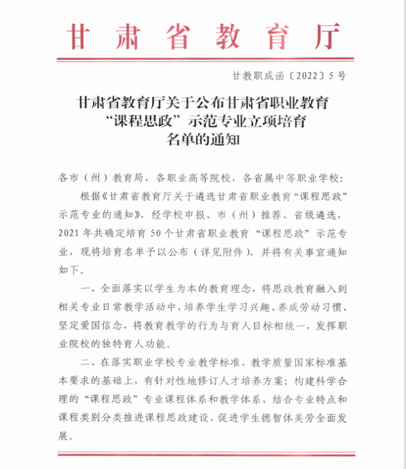 ? 近日,教育廳公布了2021年“技能甘肅”內(nèi)涵項(xiàng)目評(píng)審結(jié)果,中科低碳新能源技術(shù)學(xué)院申報(bào)的甘肅省職業(yè)教育“課程思政”示范專業(yè)、甘肅省職業(yè)教育在線精品課程、甘肅省職業(yè)教育名師工作室均獲評(píng)。
