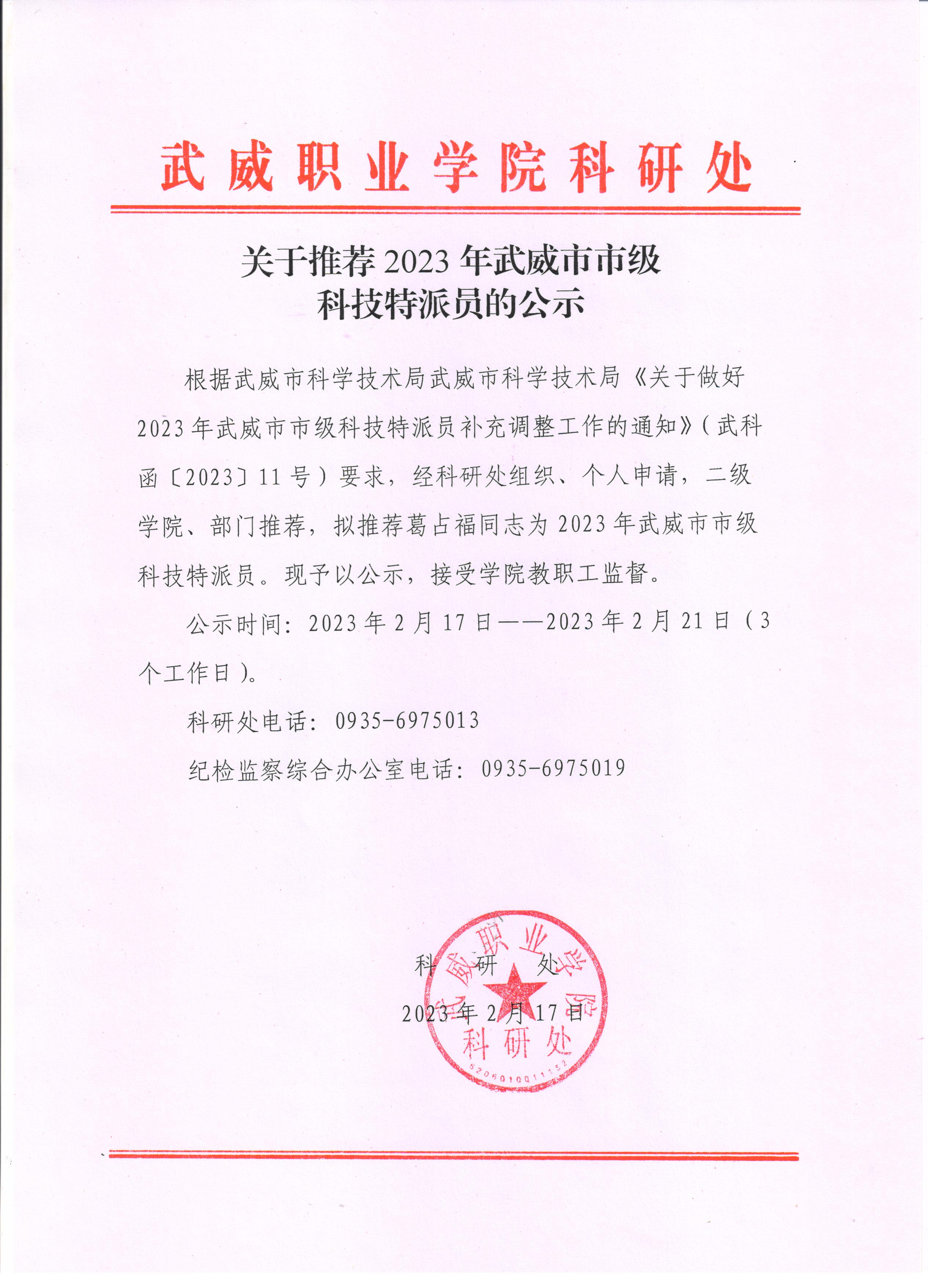 關(guān)于擬推薦2023年武威市市級(jí)科技特派員人員的公示