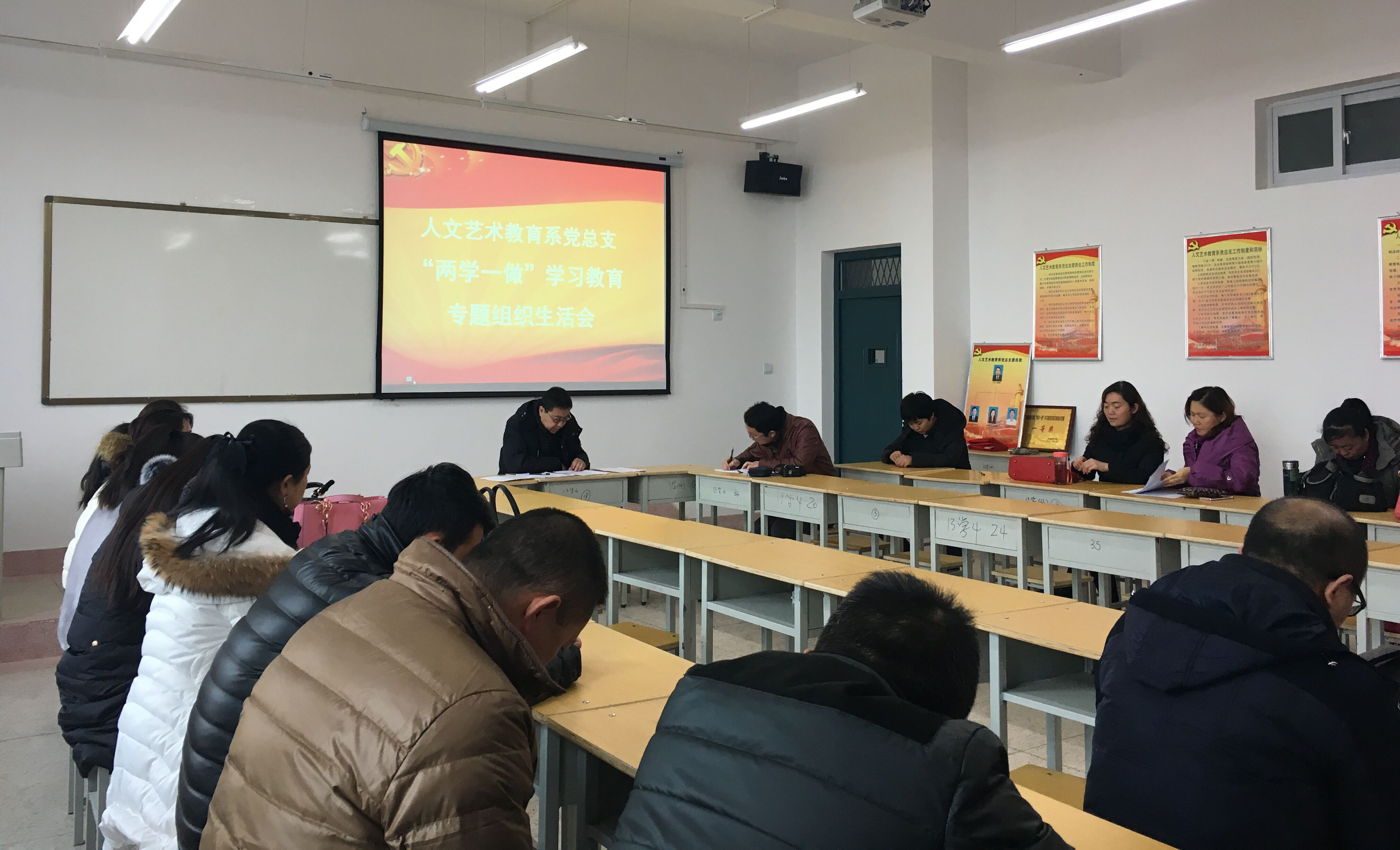 1月10日下午,人文藝術教育系黨總支在勵勤樓403黨員活動室召開了“兩學一做”學習教育專題組織生活會和民主評議黨員大會,會議由系黨總支書記胡靜峰同志主持,全體黨員及部分群眾參加了會議。