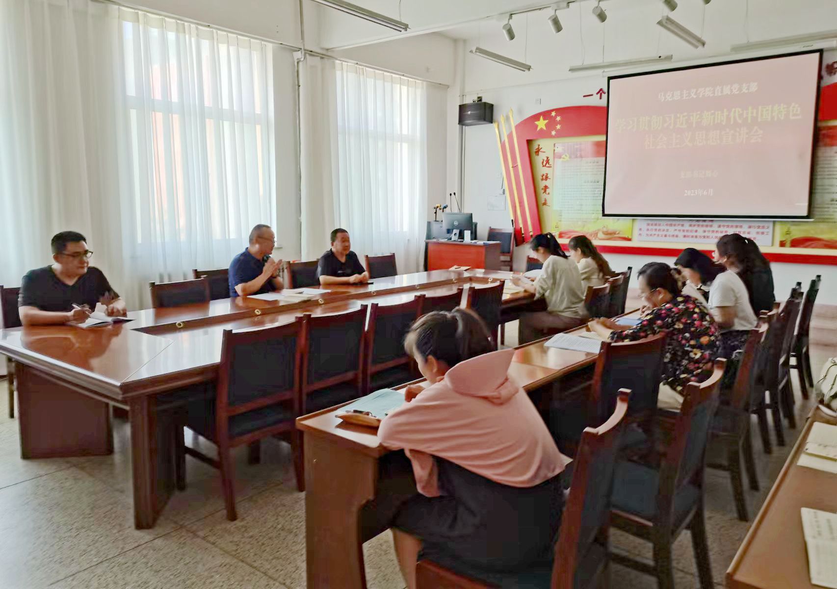為推動(dòng)學(xué)習(xí)貫徹習(xí)近平新時(shí)代中國(guó)特色社會(huì)主義思想主題教育走深走實(shí),教育引導(dǎo)教師全面學(xué)習(xí)、深刻領(lǐng)會(huì)、準(zhǔn)確把握習(xí)近平新時(shí)代中國(guó)特色社會(huì)主義思想,按照學(xué)校宣講工作部署,6月29日,馬克思主義學(xué)院黨支部開展了學(xué)習(xí)貫徹習(xí)近平新時(shí)代中國(guó)特色社會(huì)主義思想主題教育專題宣講活動(dòng),黨支部書記劉心作宣講,支部全體黨員參加活動(dòng)。