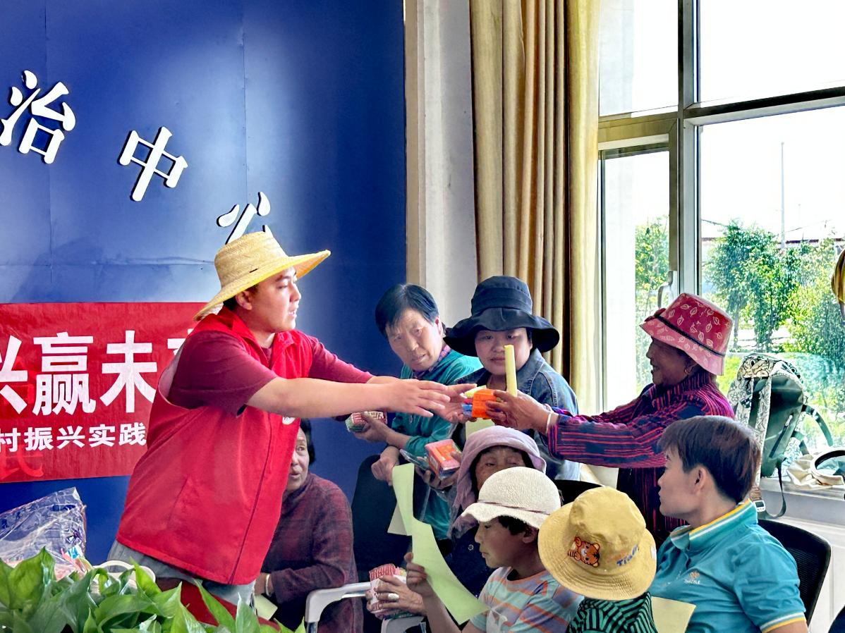 圖為實(shí)踐隊(duì)員為參與活動的婦女發(fā)放推普彩頁和物品