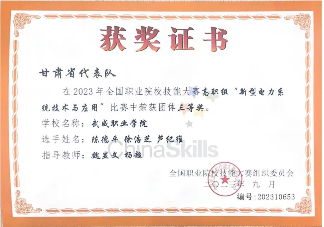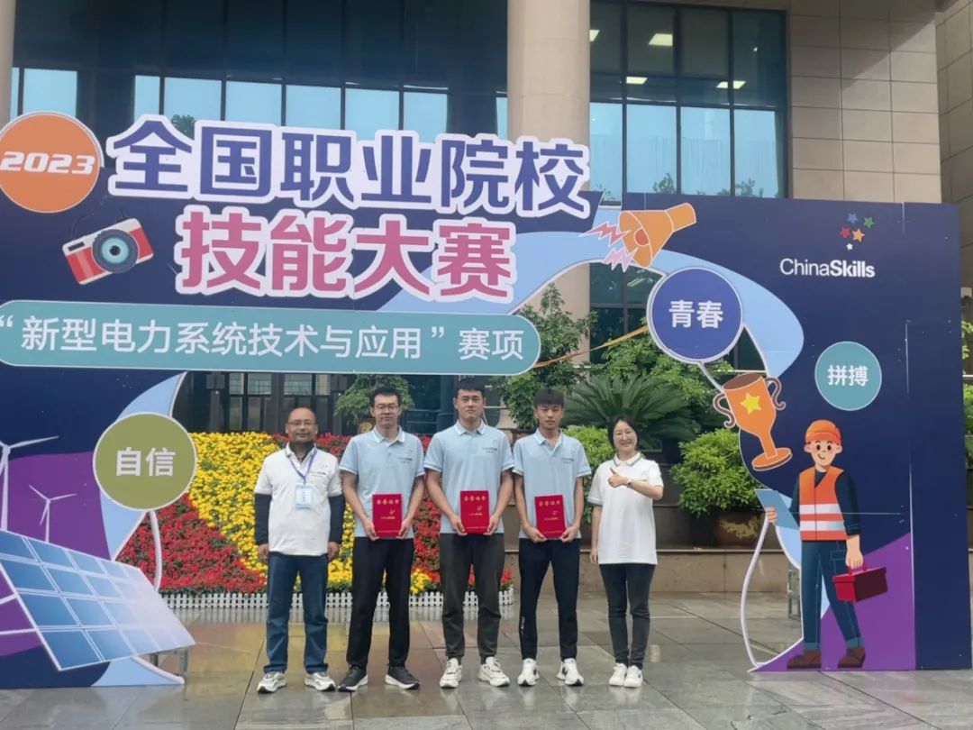 在2023年全國職業(yè)院校技能大賽中中科低碳新能源技術(shù)學(xué)院學(xué)生陳德平、徐浩芝、蘆紀(jì)維獲得高職組新型電力系統(tǒng)技術(shù)與應(yīng)用賽項(xiàng)團(tuán)體三等獎。