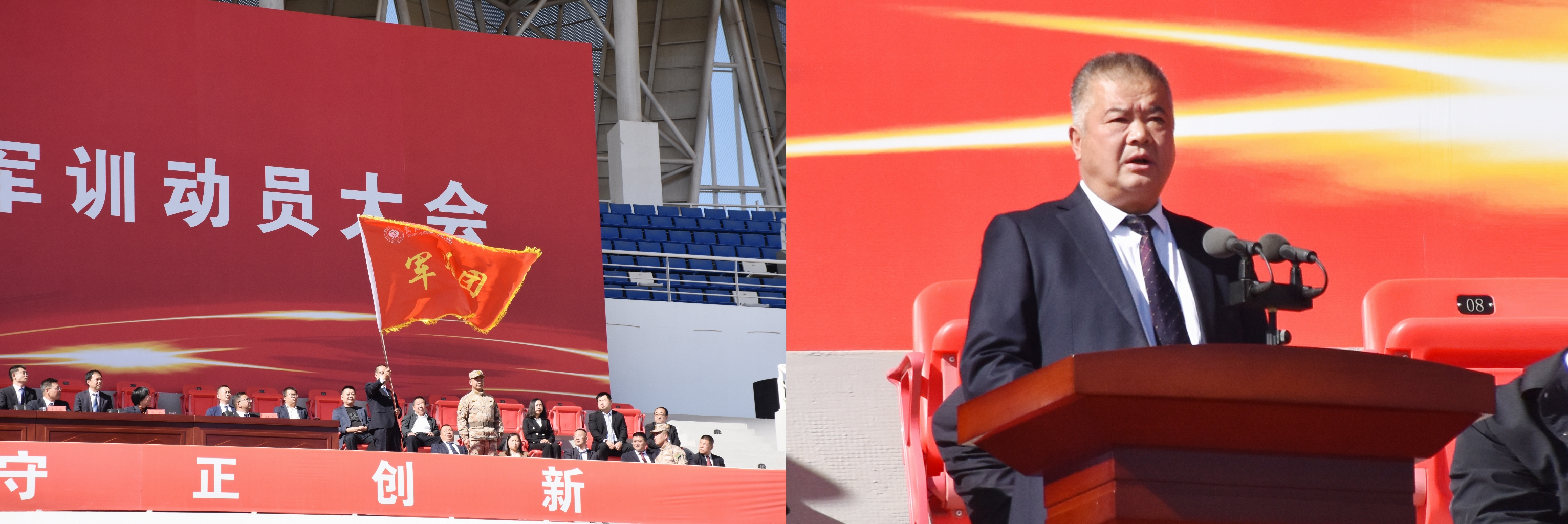 軍訓(xùn)動(dòng)員階段,黨委委員,副校長(zhǎng)王守云安排了2023級(jí)新生軍訓(xùn)工作,軍訓(xùn)教官李昌泰作發(fā)言,黨委副書(shū)記翟存祥向軍訓(xùn)團(tuán)授旗。