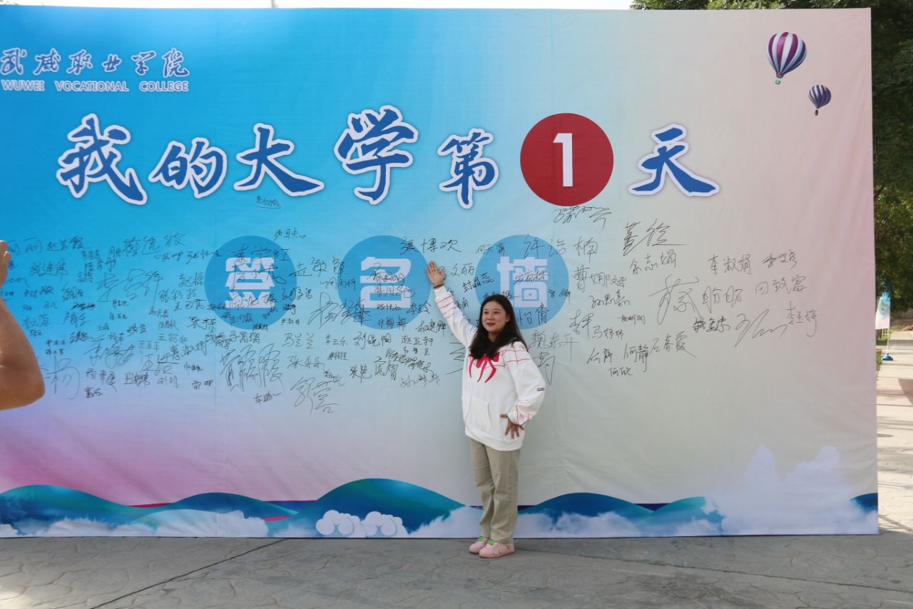 新同學(xué)滿懷期盼和憧憬與校門合個(gè)影,