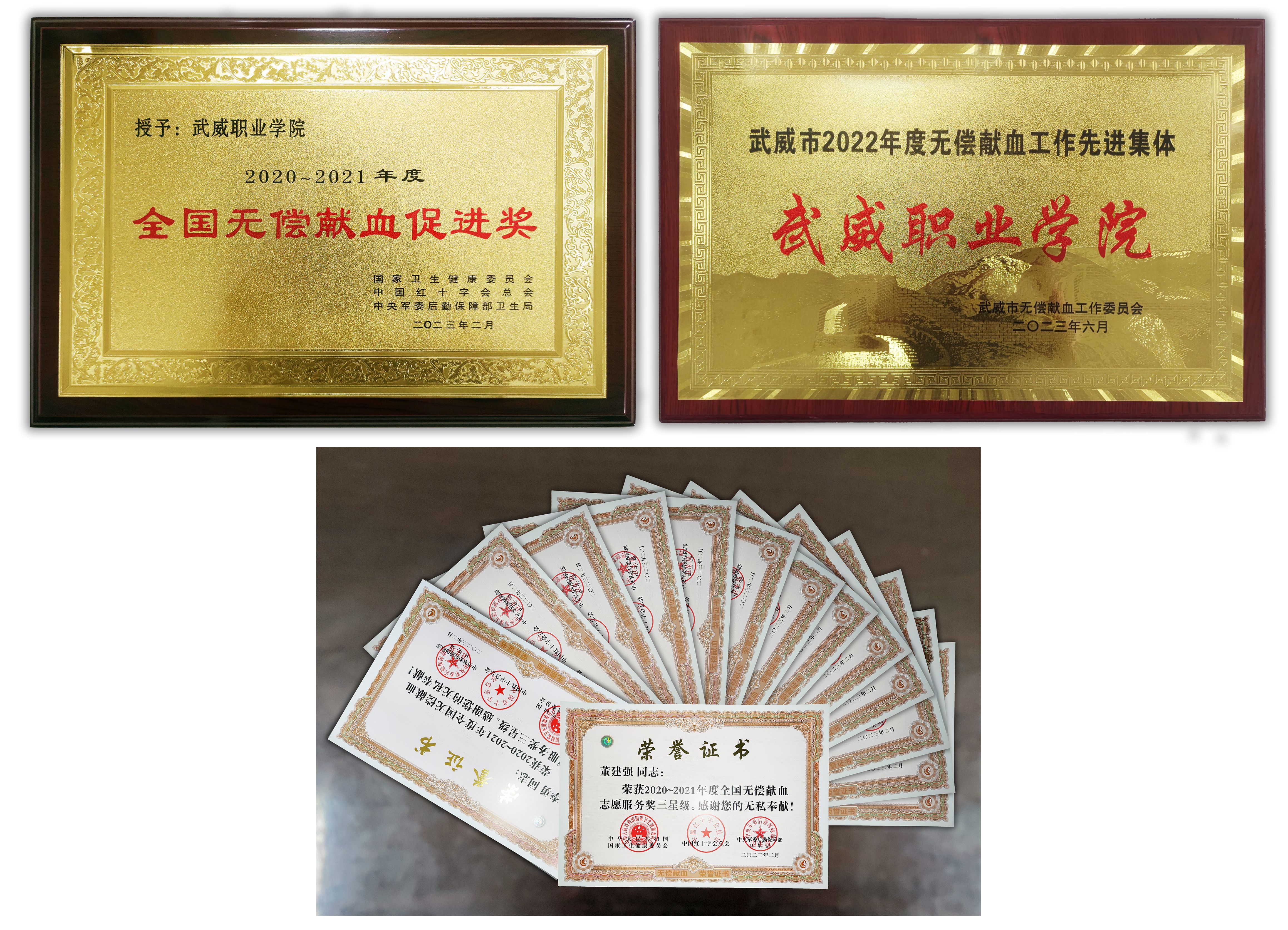 學(xué)校繼2020年獲得“2018-2019年度全國無償獻(xiàn)血促進(jìn)獎(jiǎng)”后,再次榮獲“2020-2021年度全國無償獻(xiàn)血促進(jìn)獎(jiǎng)”,14名師生榮獲全國無償獻(xiàn)血志愿服務(wù)獎(jiǎng)。我校護(hù)理學(xué)院被評為武威市2022年度無償獻(xiàn)血工作先進(jìn)集體,1名教師被評為先進(jìn)個(gè)人。