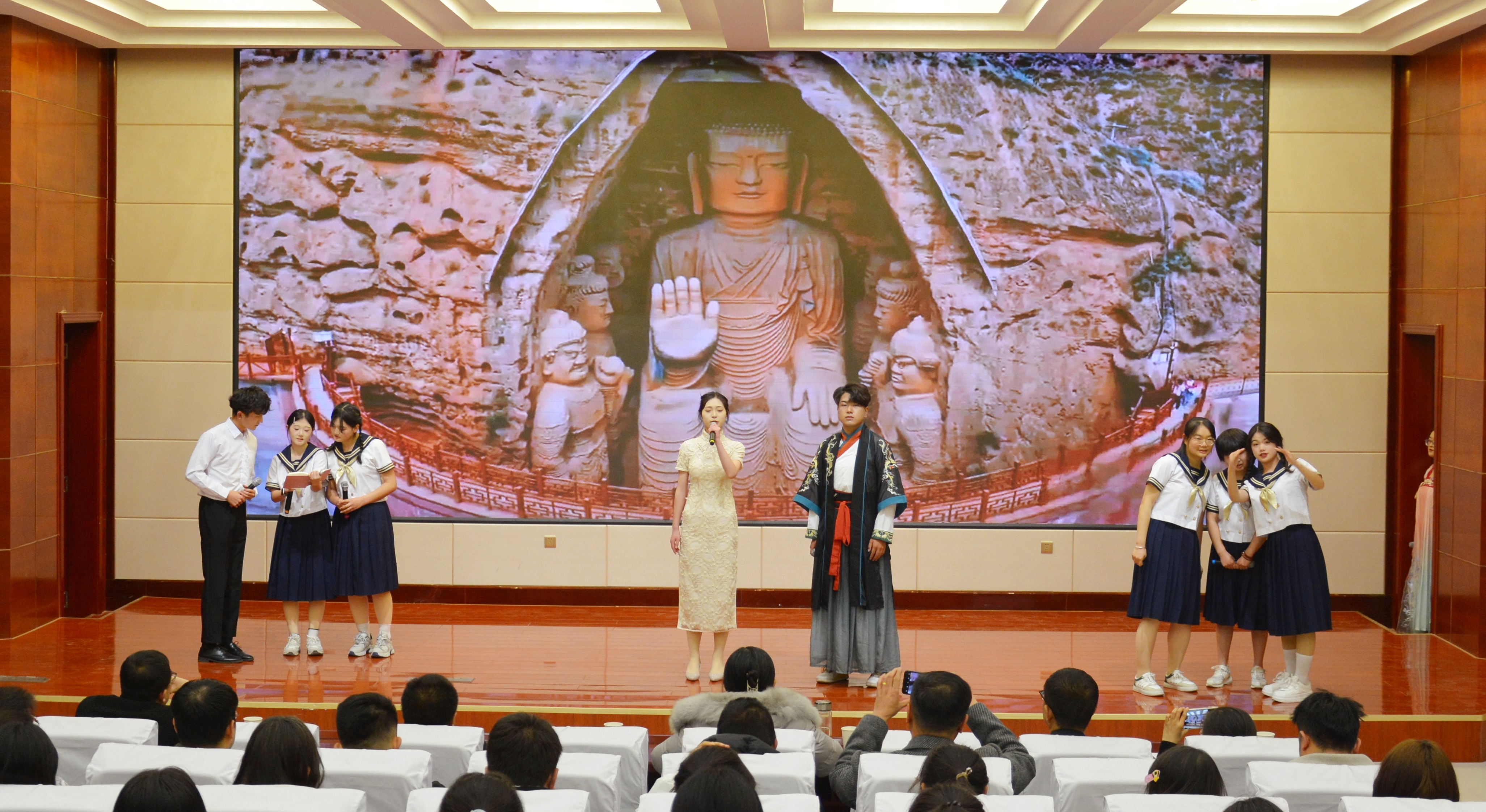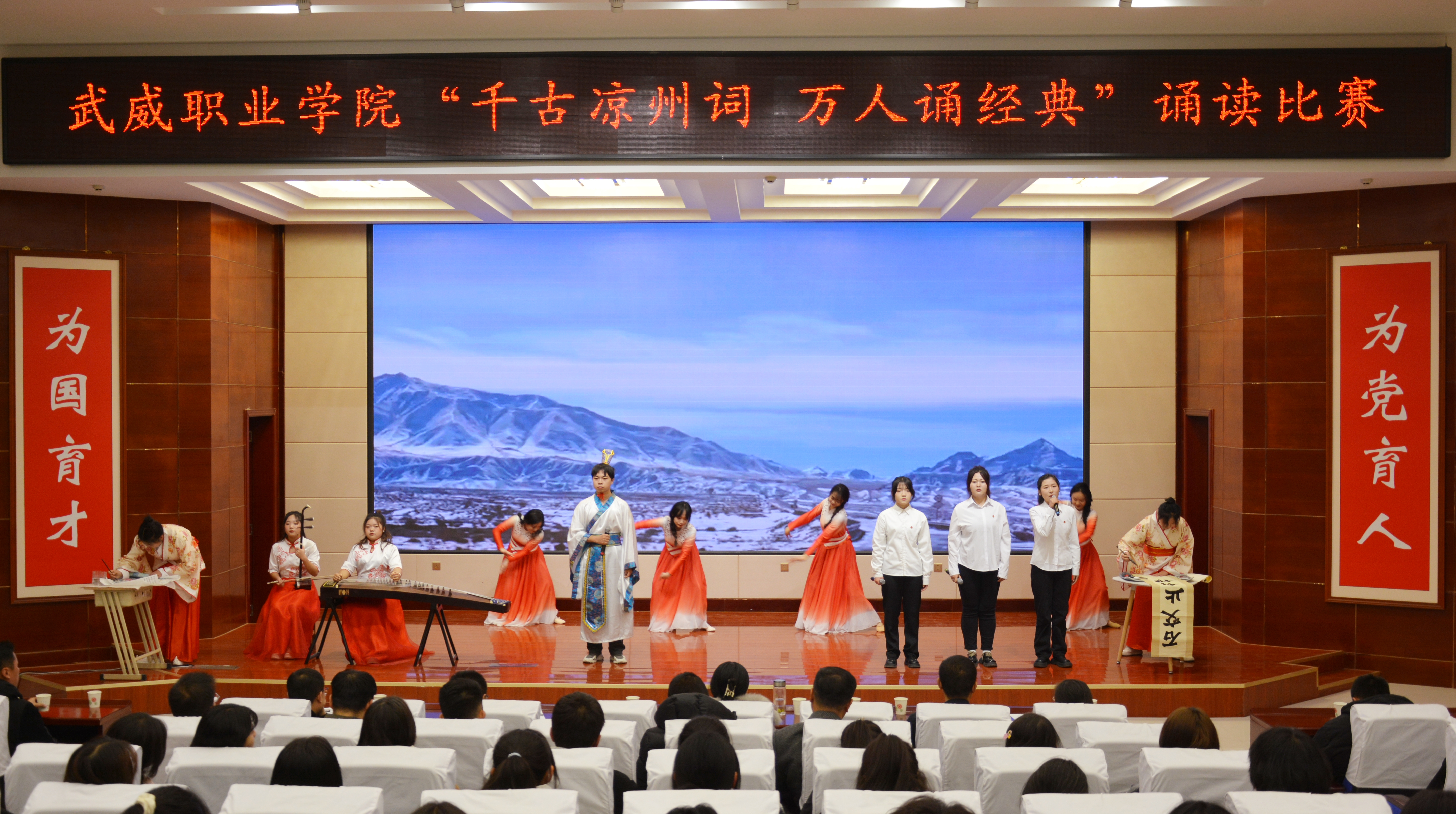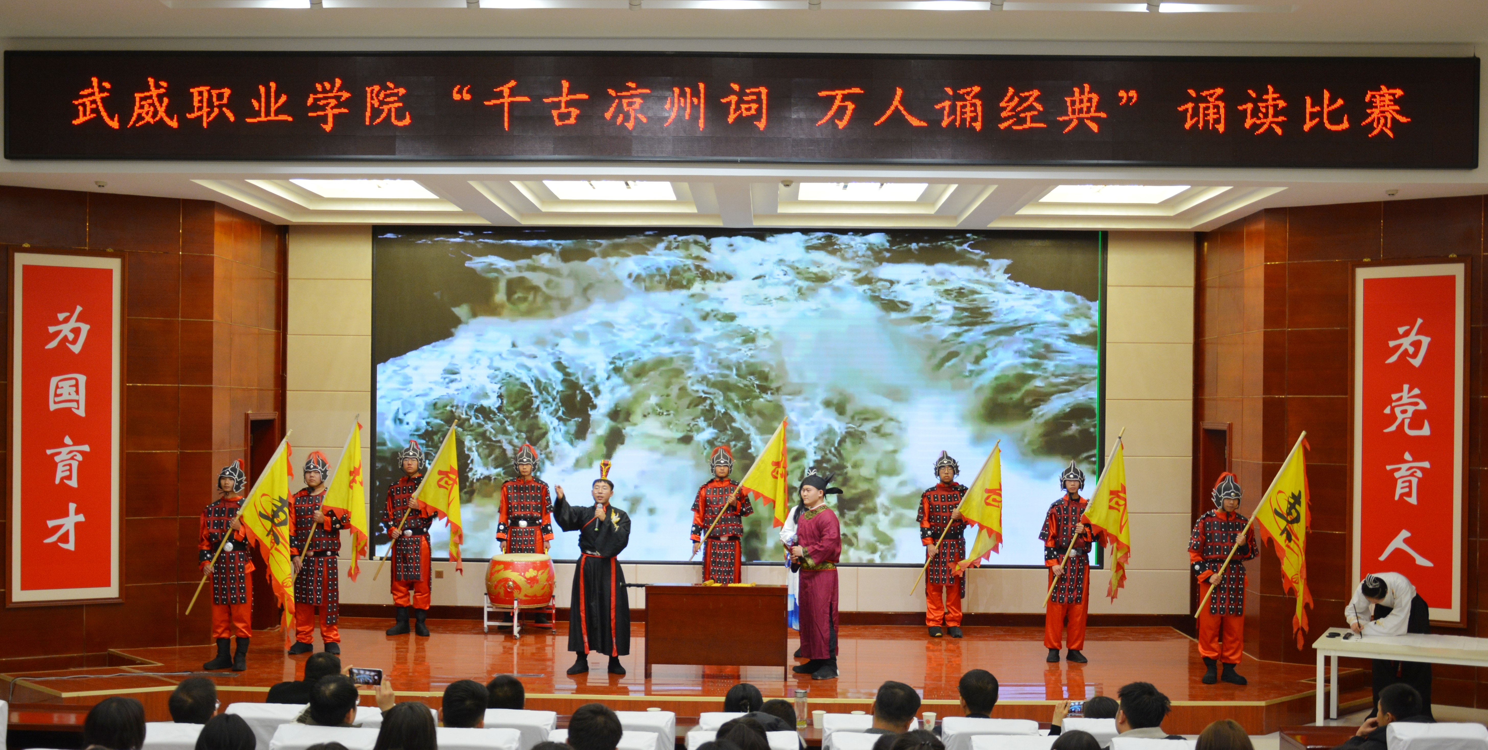 比賽現(xiàn)場精彩紛呈,現(xiàn)場氣氛異常熱烈,掌聲此起彼伏。節(jié)目以詩歌吟誦、伴舞、書法、國畫、武術、情景表演等豐富多彩的藝術形式,為現(xiàn)場觀眾打造出一場別開生面的涼州文化視聽盛宴。同學們激情洋溢,用澎湃真摯的情感演繹著經(jīng)典燦爛的磅礴詩篇,用跨越千年的對話勾勒出雄渾壯烈的漢武雄風,用鏗鏘有力的旋律編織出蕩氣回腸的時代頌歌,以青春奮斗的初心賡續(xù)著生生不息的五涼文化。