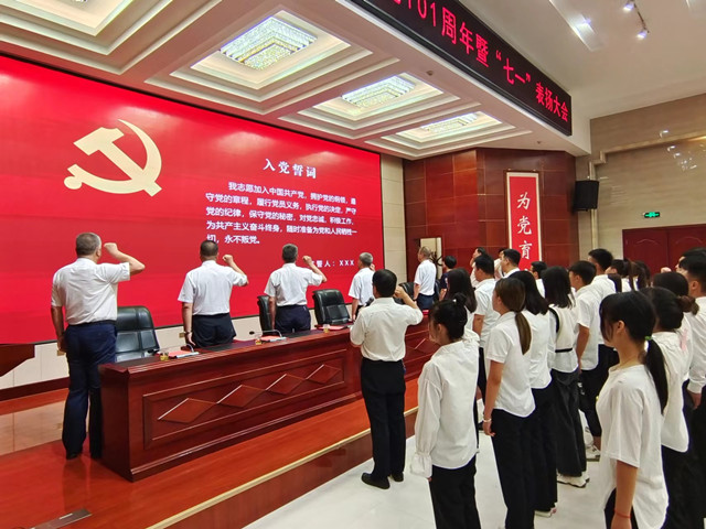 大會(huì)在嘹亮的國(guó)歌聲中拉開(kāi)帷幕。面對(duì)鮮紅的黨旗,新黨員進(jìn)行入黨宣誓、老黨員重溫入黨誓詞。