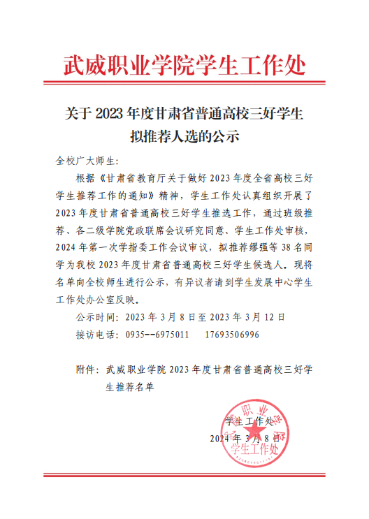 關(guān)于2023年度甘肅省普通高校三好學(xué)生擬推薦人選的公示