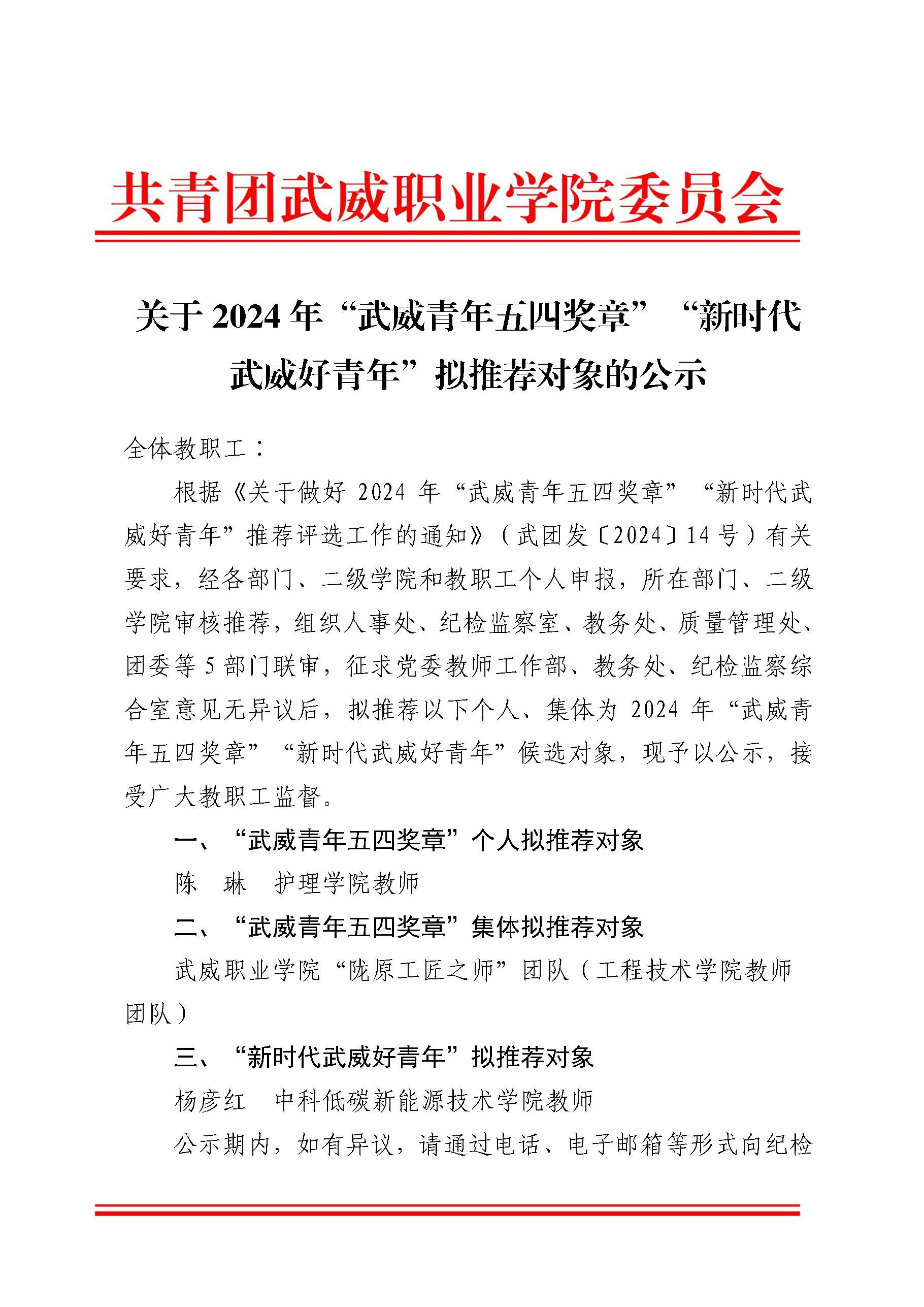 關(guān)于2024年“武威青年五四獎章“”新時代武威好青年“擬推薦對象的公示